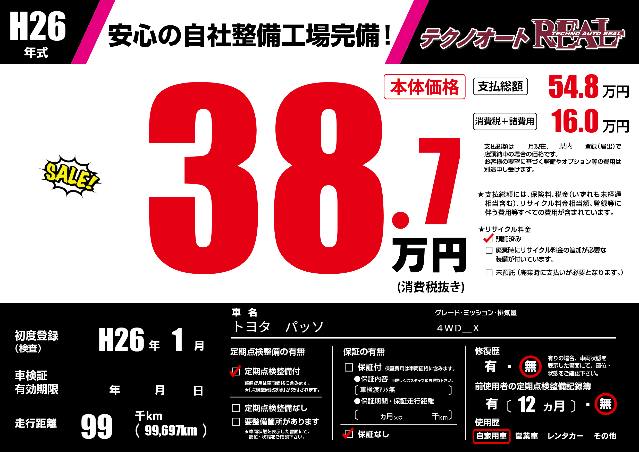 | 車名 | トヨタ パッソ | グレード ミッション 排気量 |