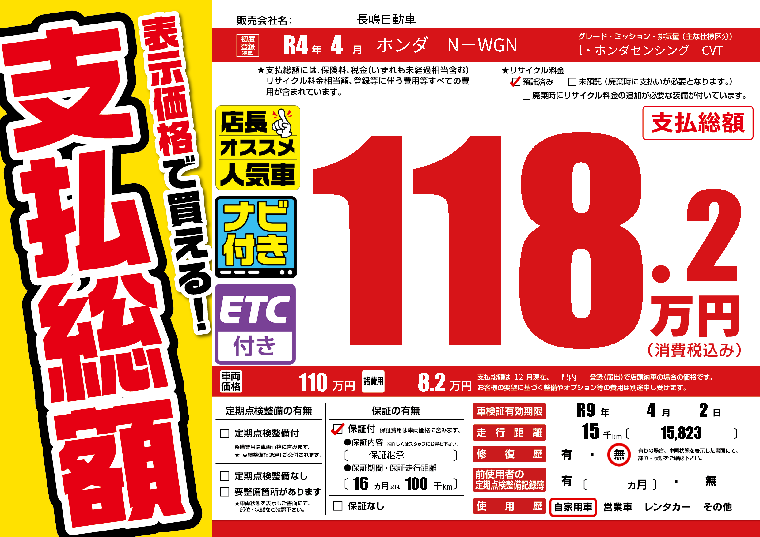 保証付き 保証内容( 保証継承) 16ヶ月または(100)千kmまで |
