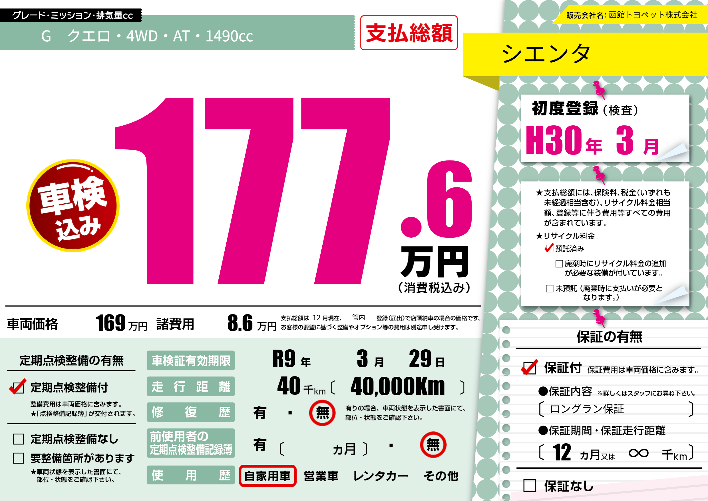 | 車名 | シエンタ | グレード ミッション 排気量 |
