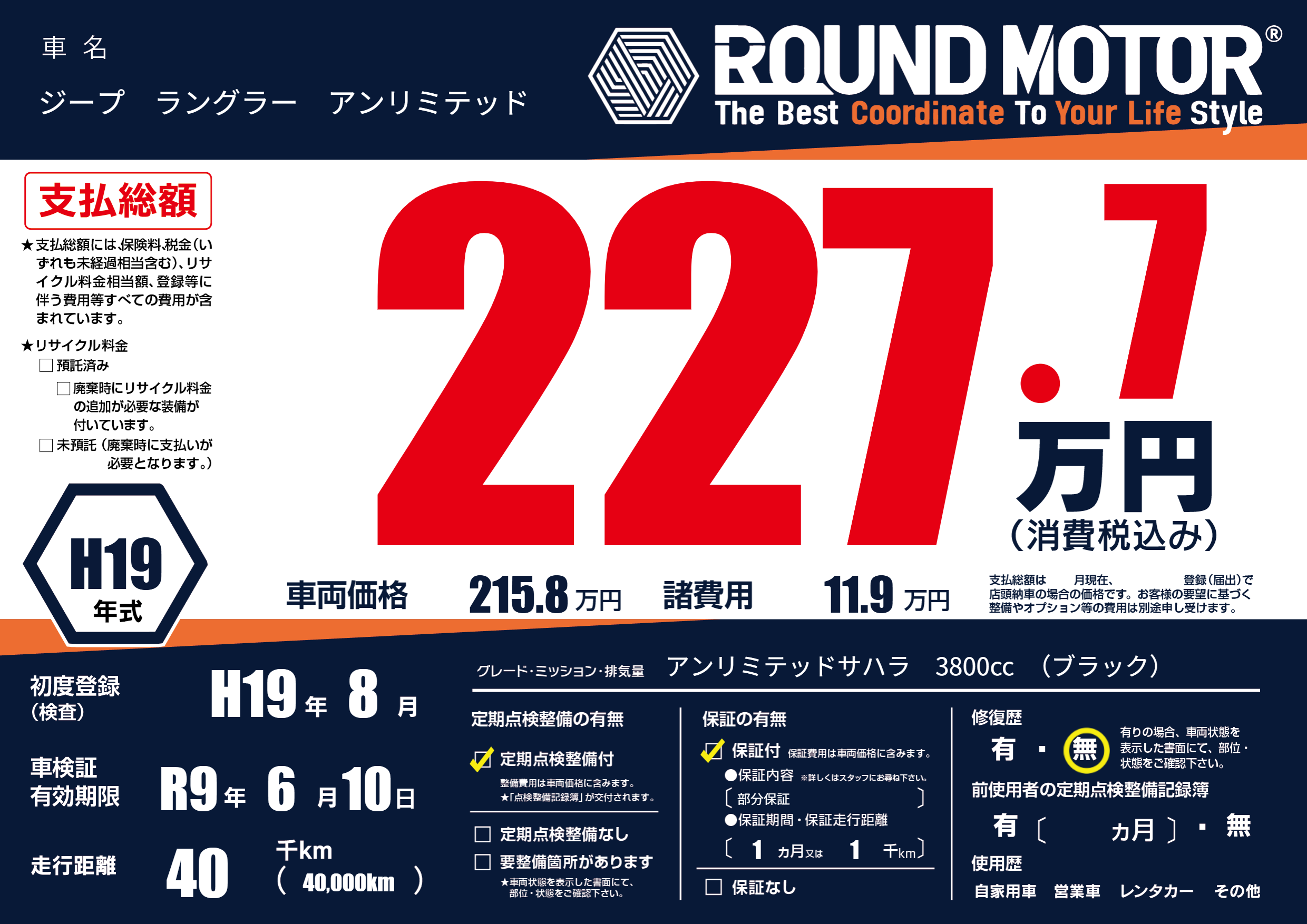 | 車名 | ジープ ラングラー アンリミテッド | グレード ミッション 排気量 |