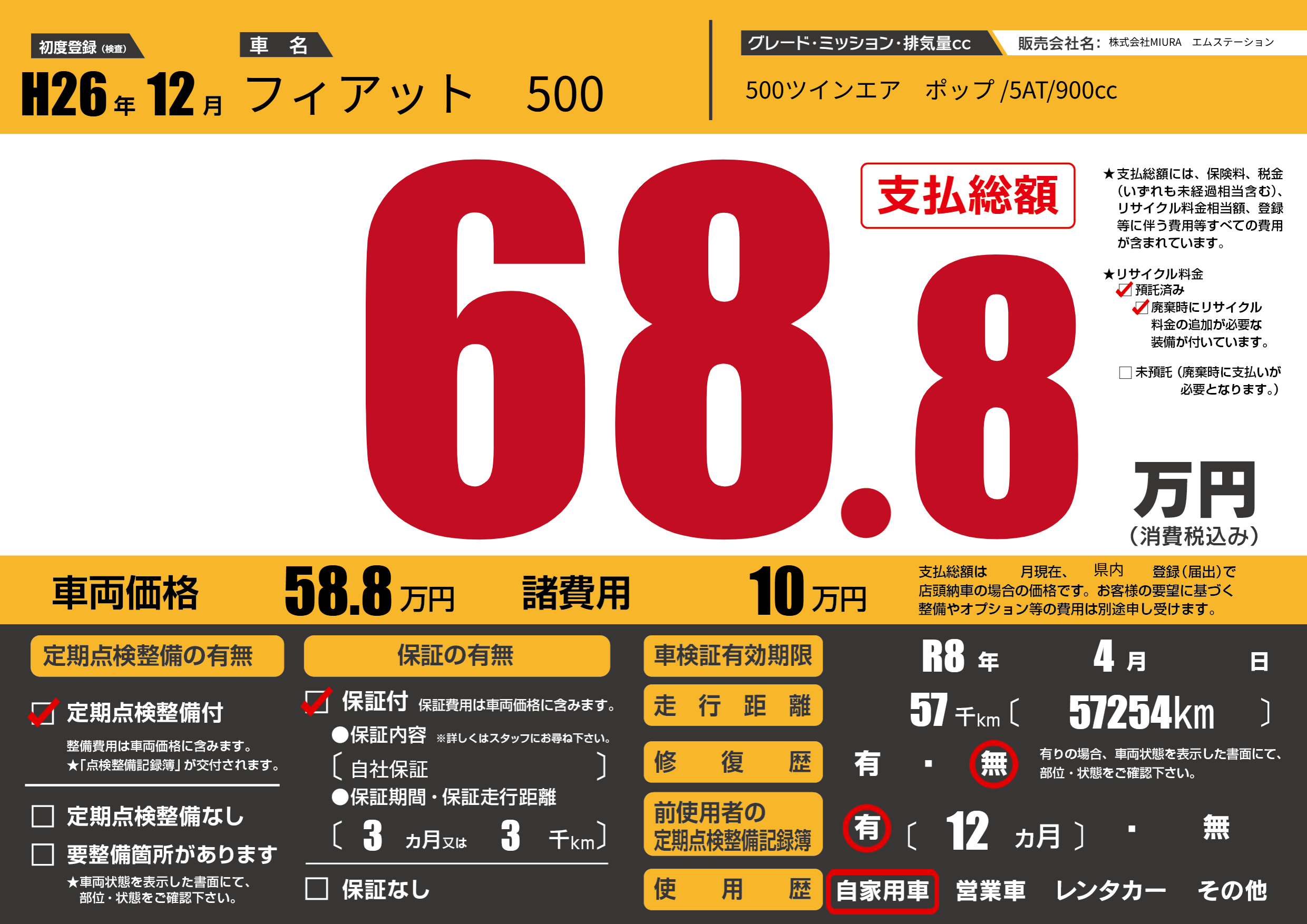 | 車名 | フィアット 500 | グレード ミッション 排気量 |