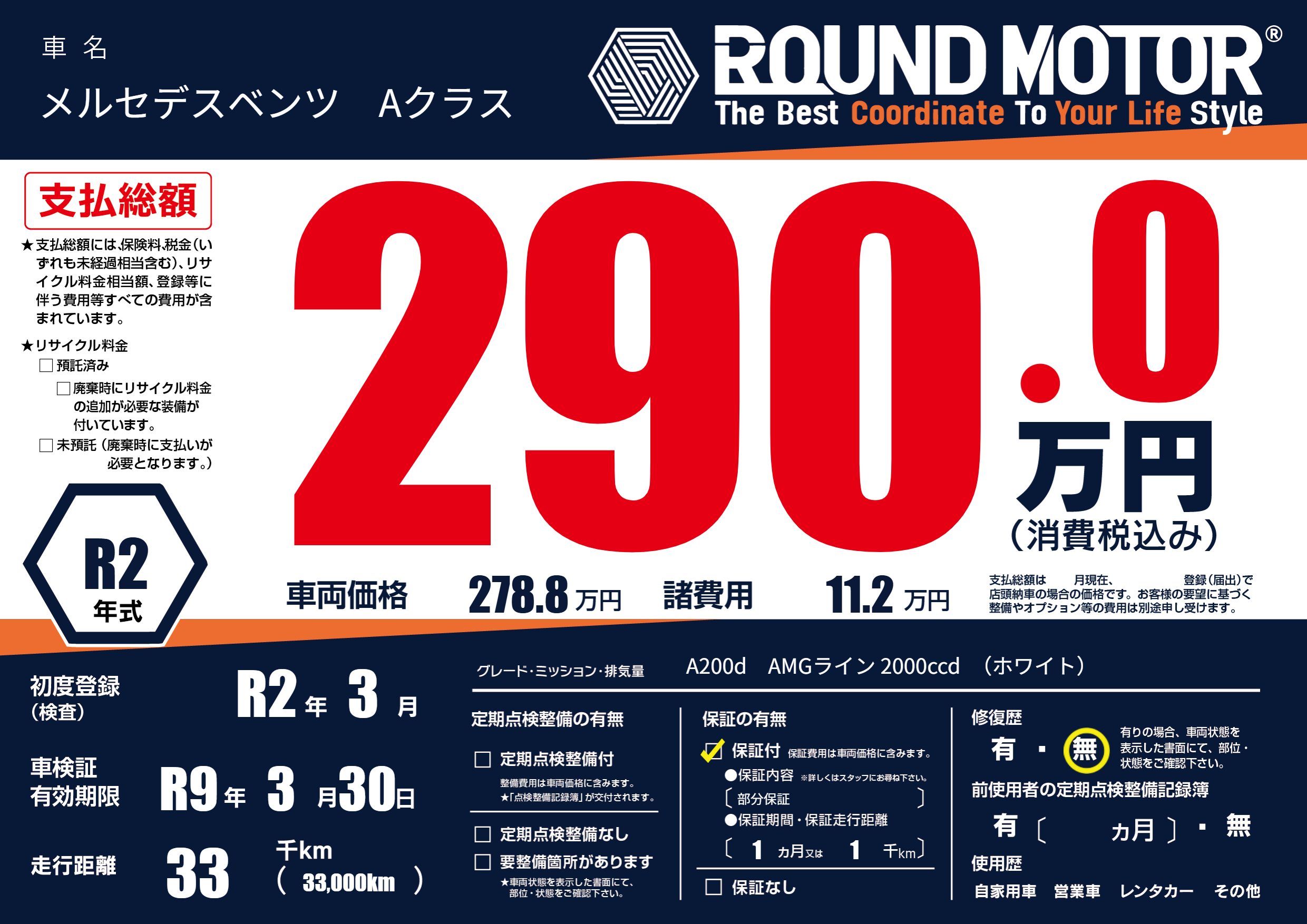 | 車名 | メルセデスベンツ Aクラス | グレード ミッション 排気量 |