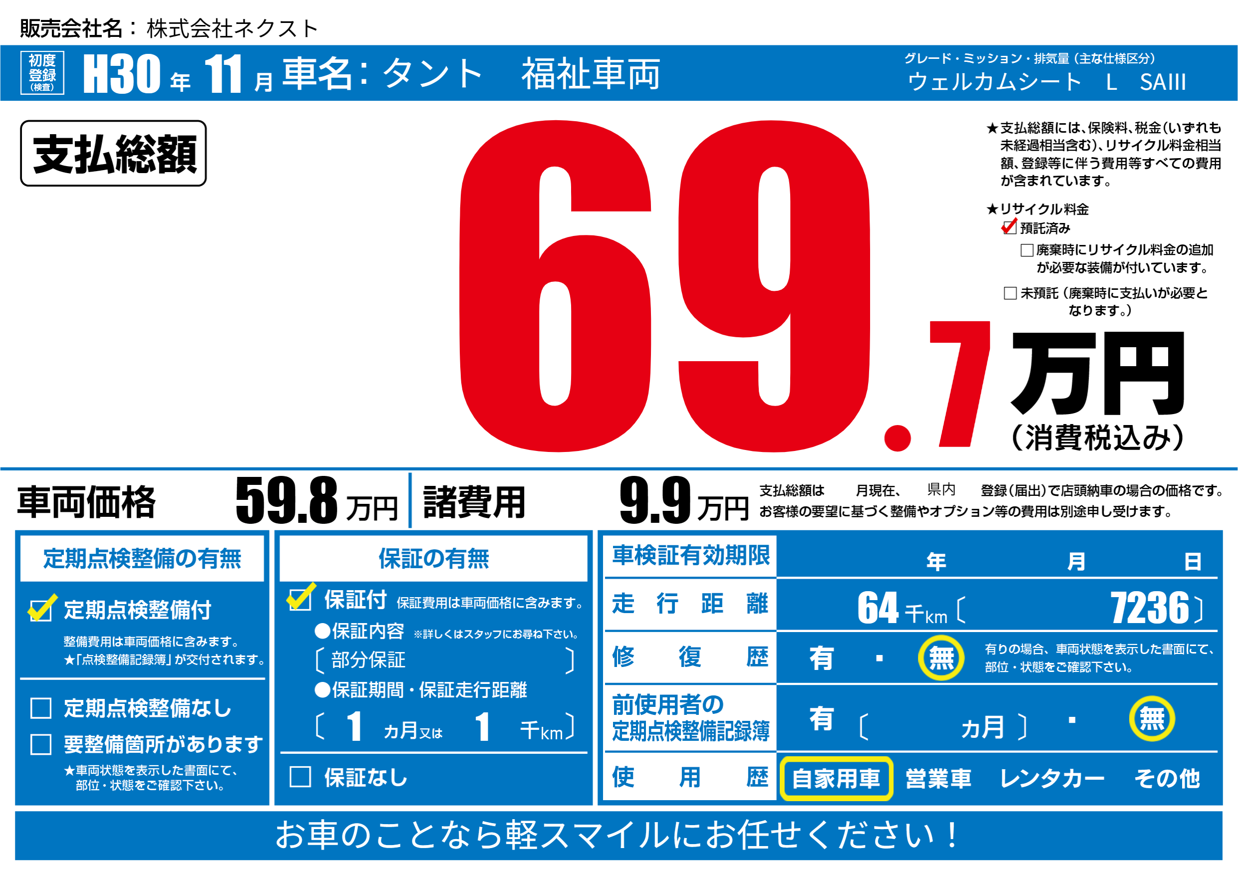 | 車名 | タント 福祉車両 | グレード ミッション 排気量 |