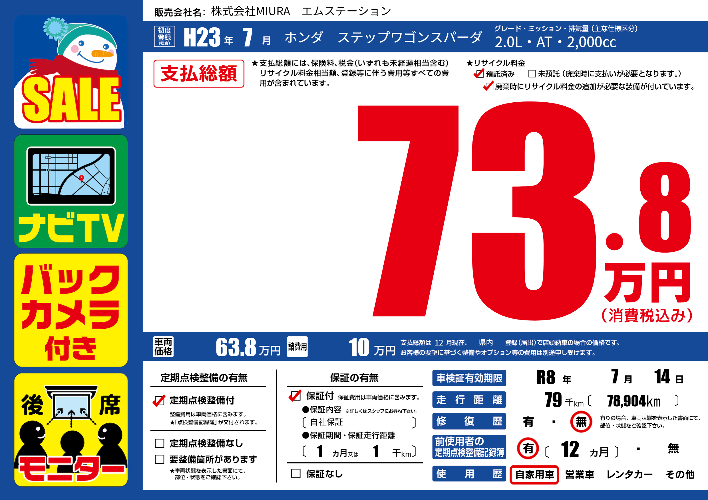 | 走行キロ | 7.9万km | 初年度登録 | H23年7月 |