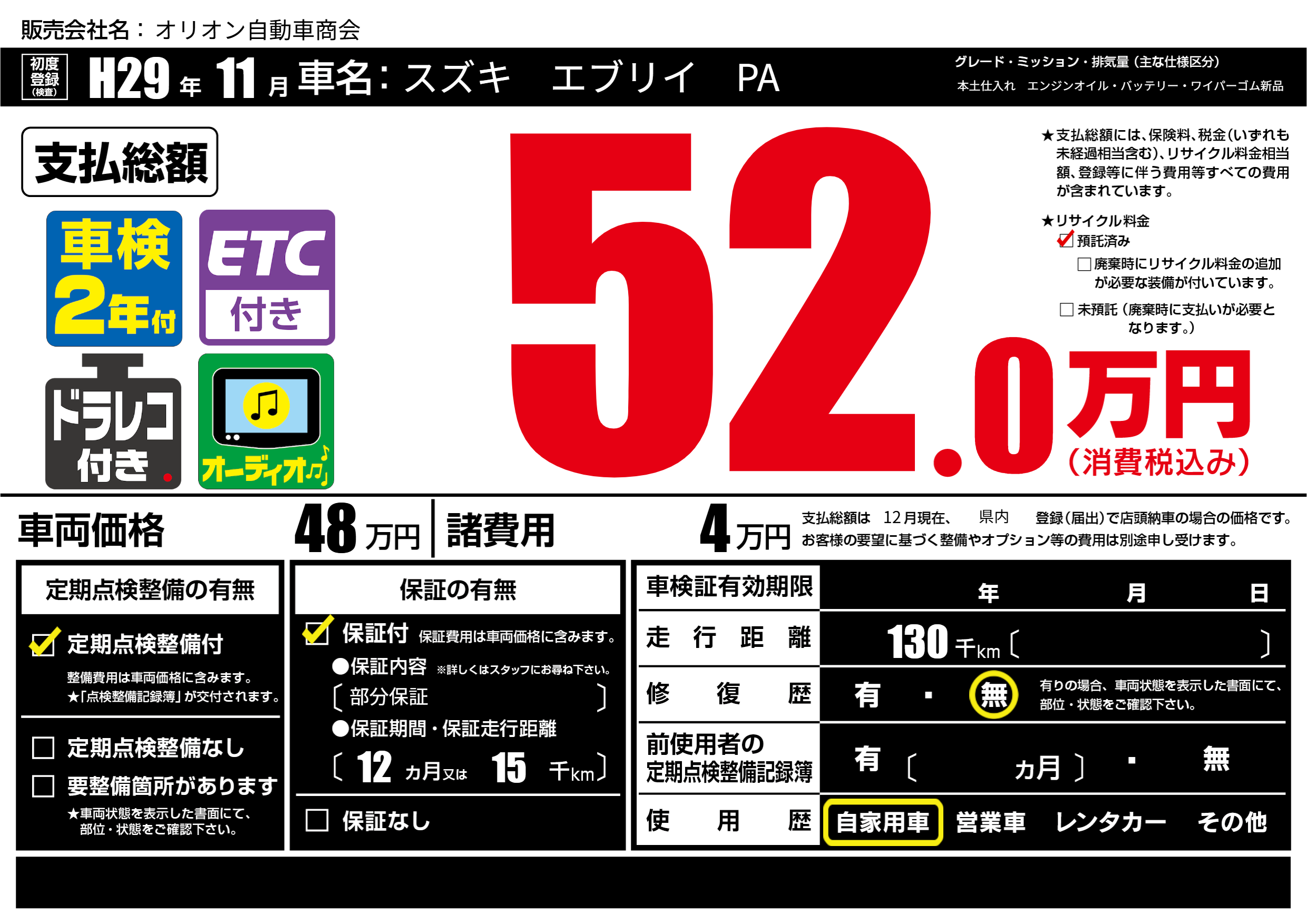 | 走行キロ | 13万km | 初年度登録 | H29年11月 |
