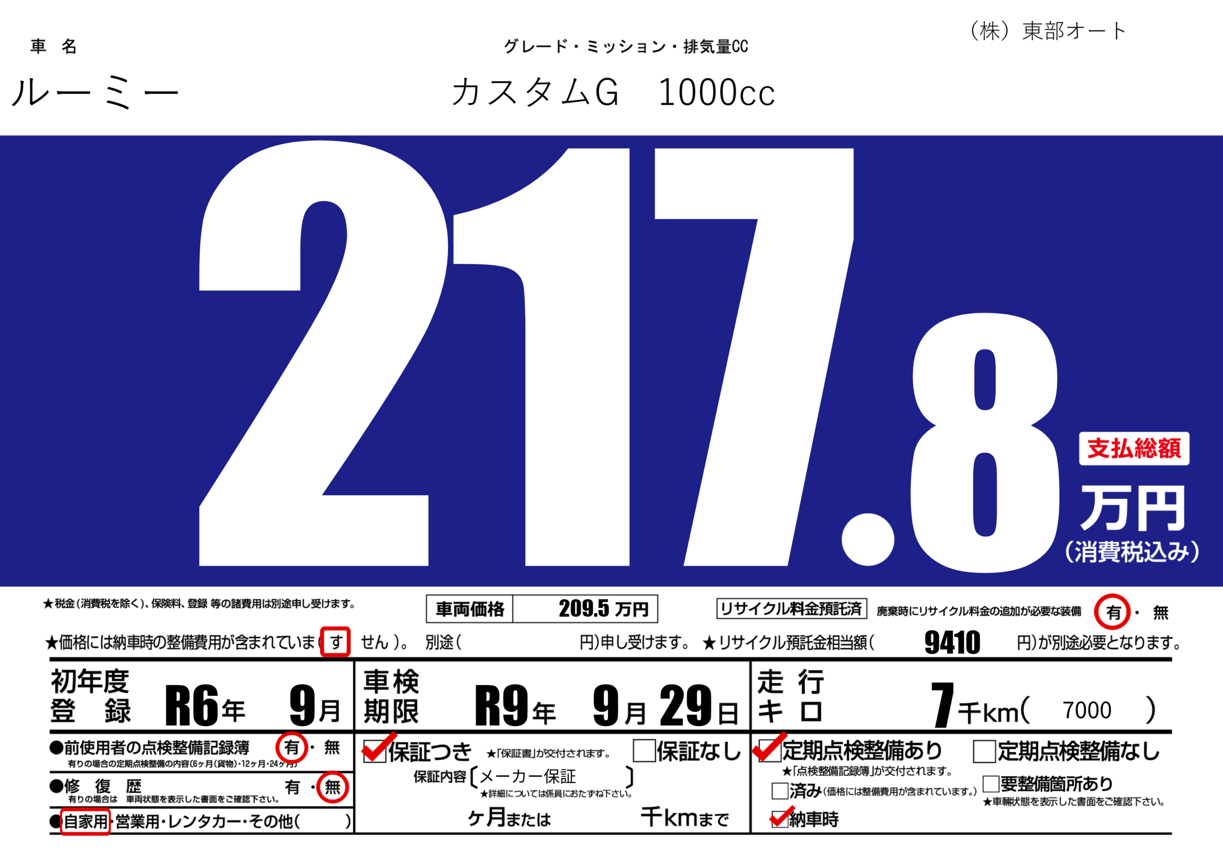 | 走行キロ | 0.7万km | 初年度登録 | R6年9月 |
