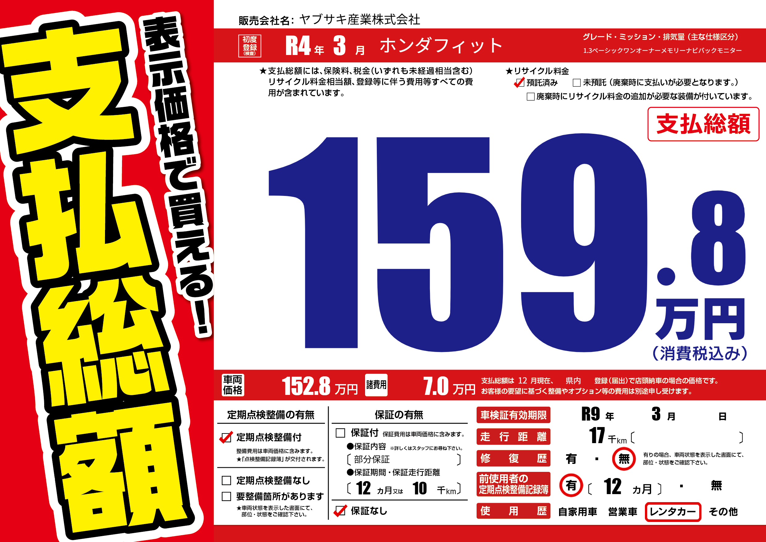 | 車検制限 | R9年 3月 - 日 | ||