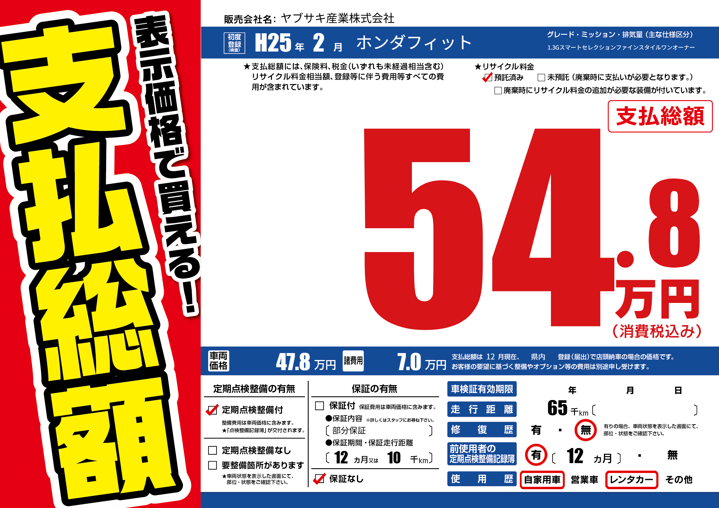 | 車名 | ホンダフィット | グレード ミッション 排気量 |
