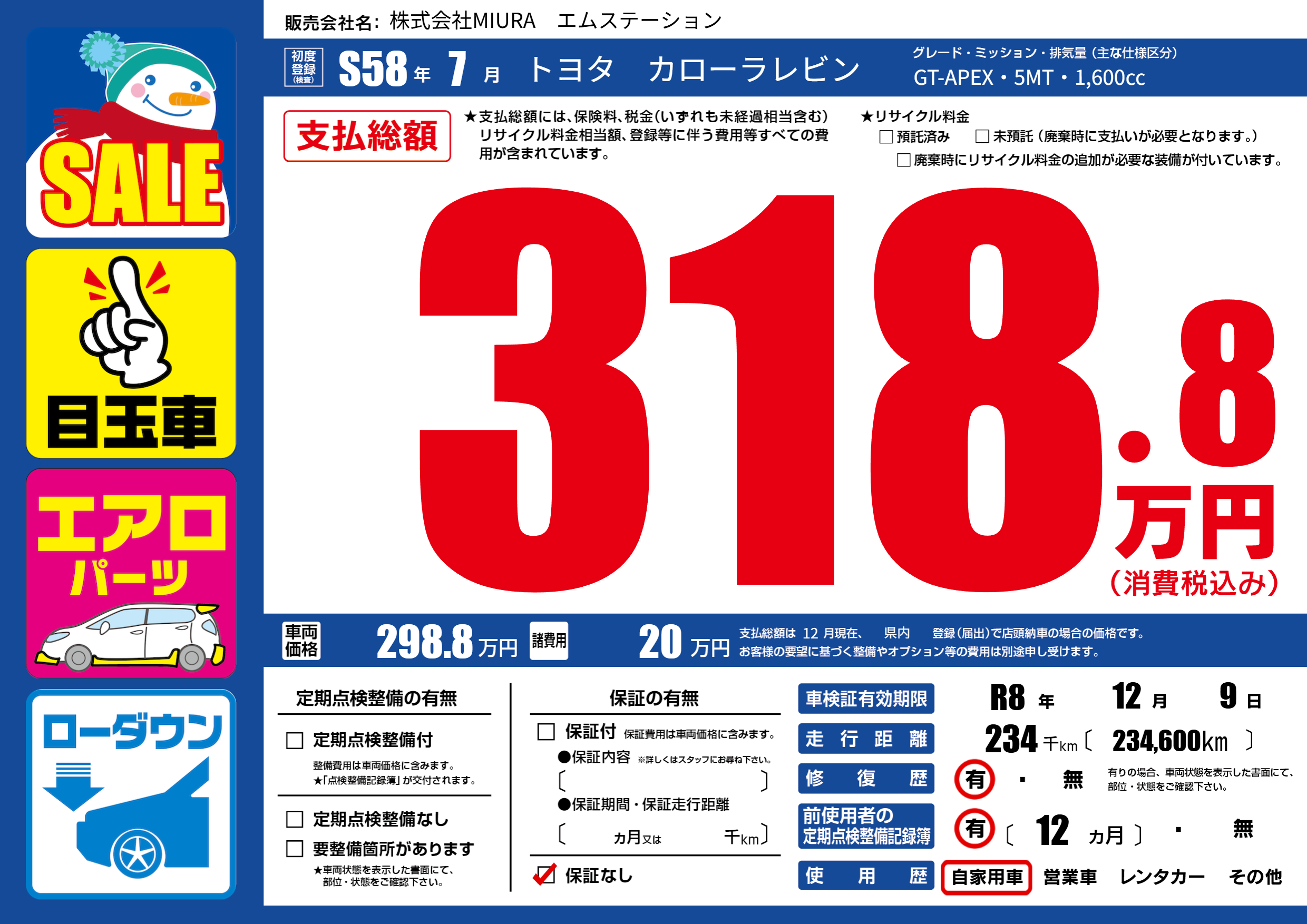 | 車名 | トヨタ カローラレビン | グレード ミッション 排気量 |