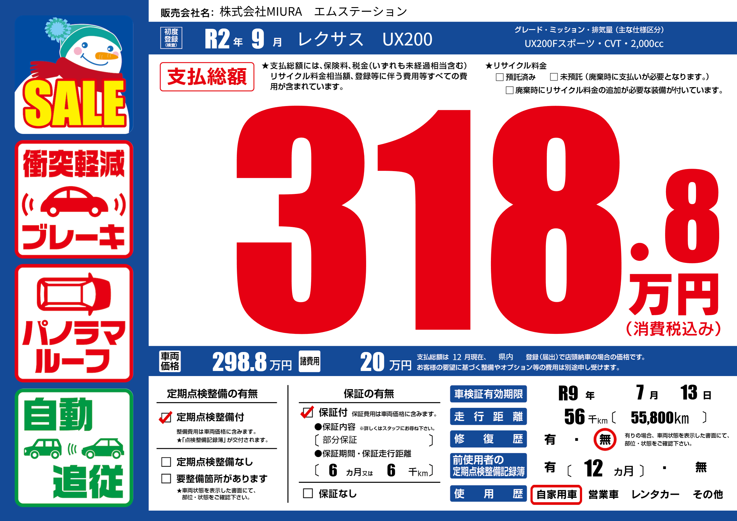 | 車名 | レクサス UX200 | グレード ミッション 排気量 |