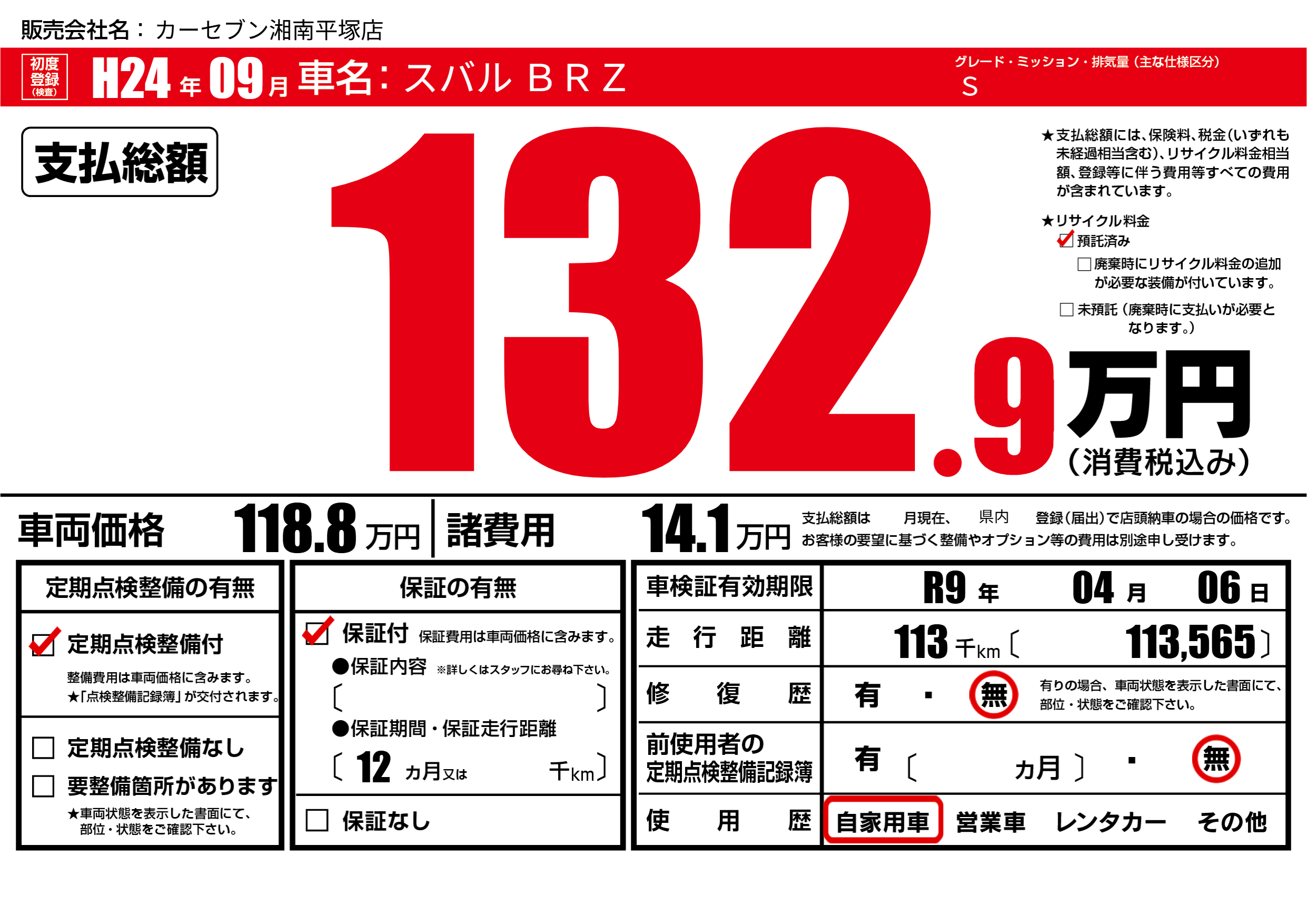 | 走行キロ | 11.3万km | 初年度登録 | H24年09月 |