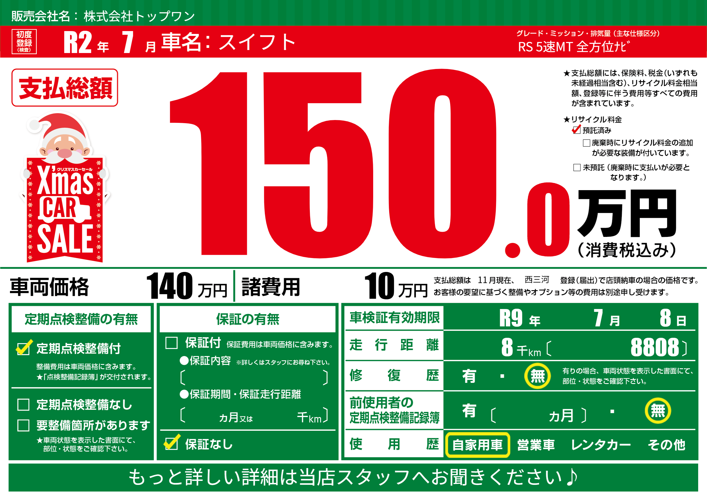 | 走行キロ | 0.8万km | 初年度登録 | R2年7月 |