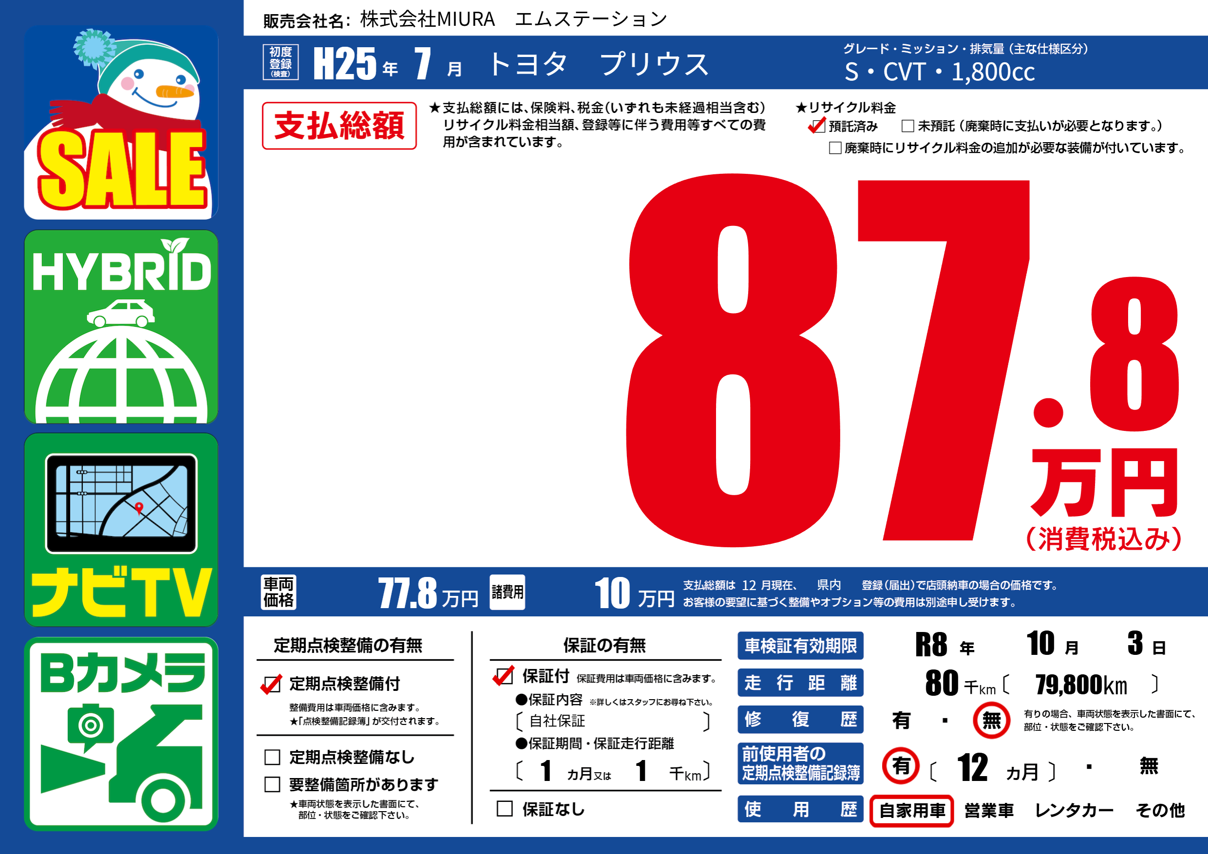 | 走行キロ | 8万km | 初年度登録 | H25年7月 |