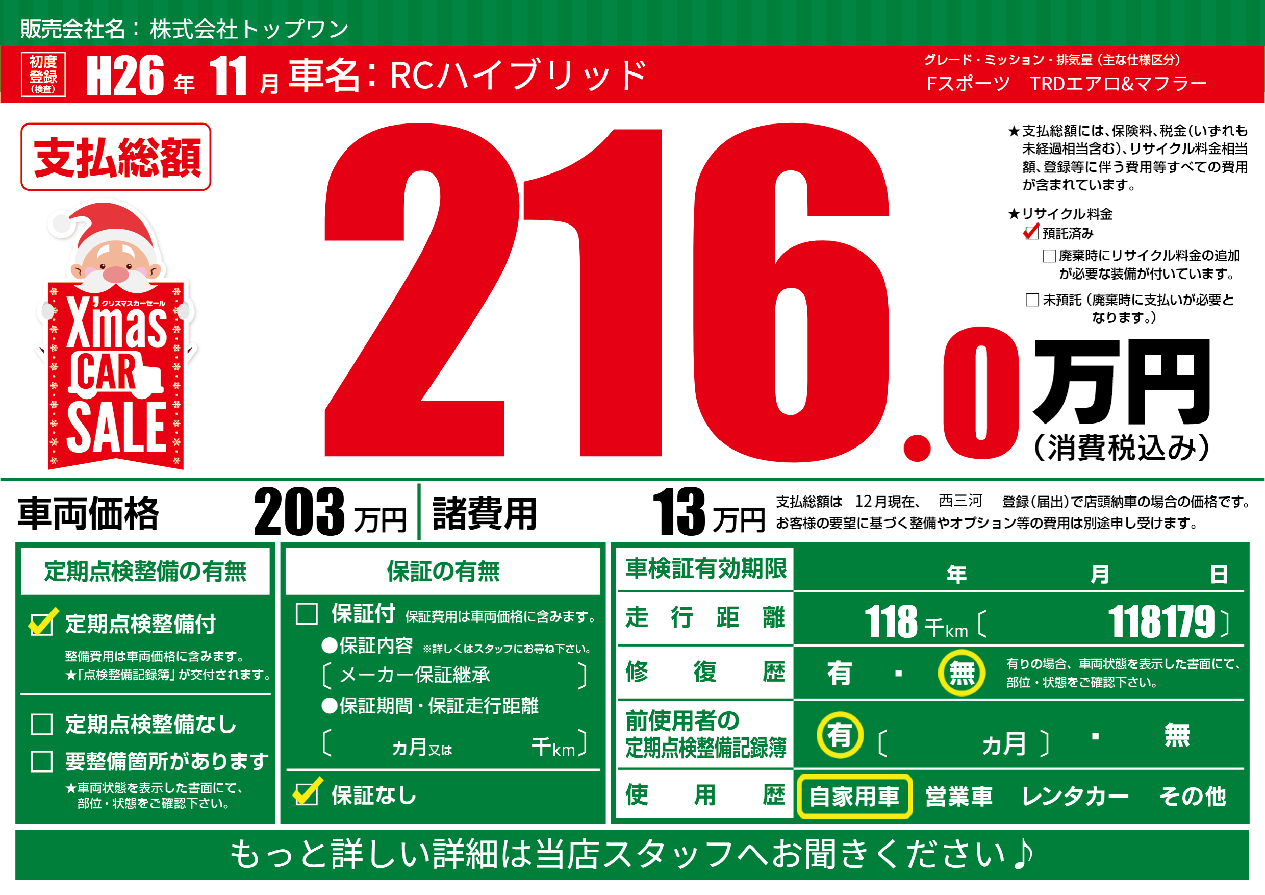 | 走行キロ | 11.8万km | 初年度登録 | H26年11月 |