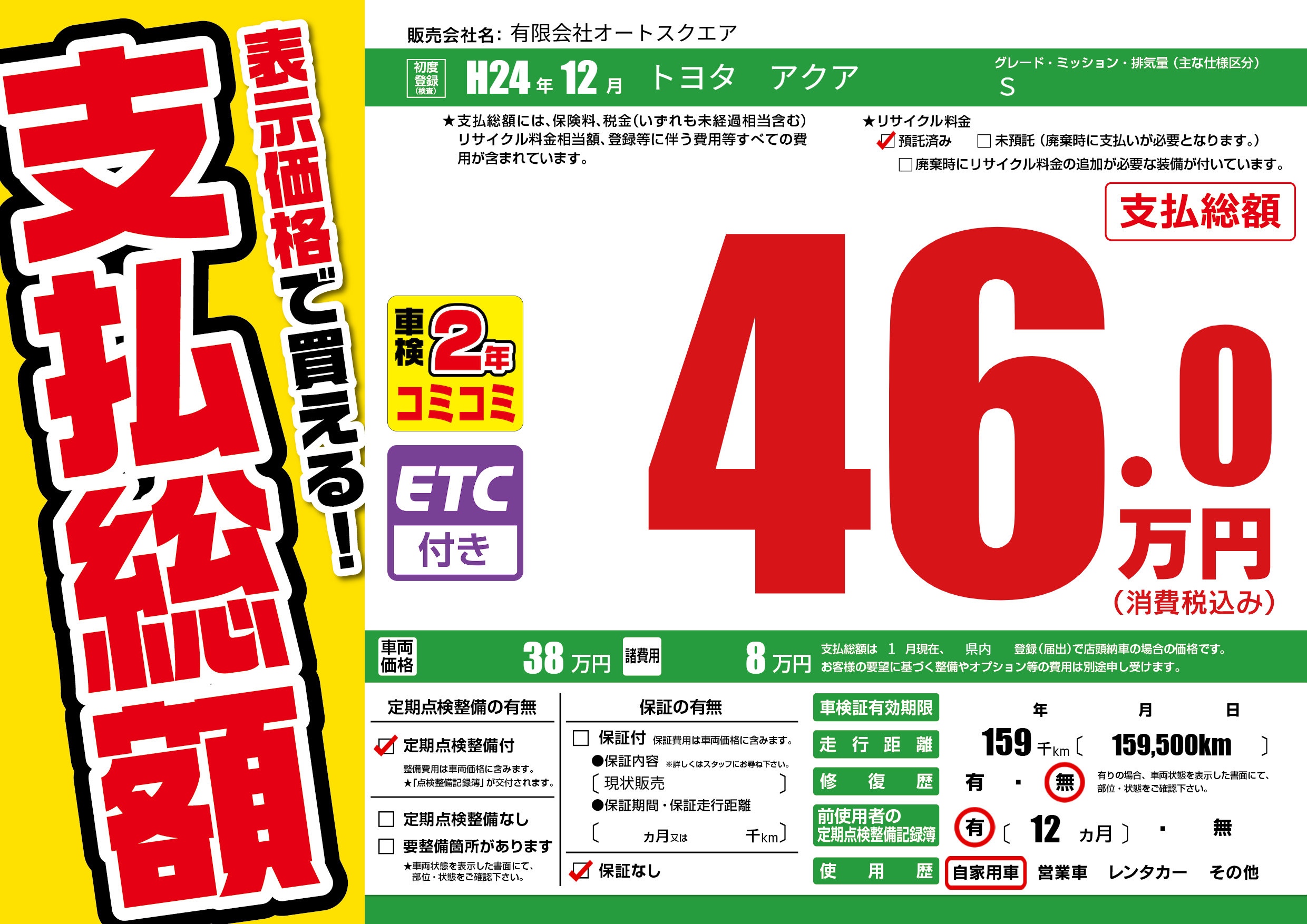 | 走行キロ | 15.9万km | 初年度登録 | H24年12月 |
