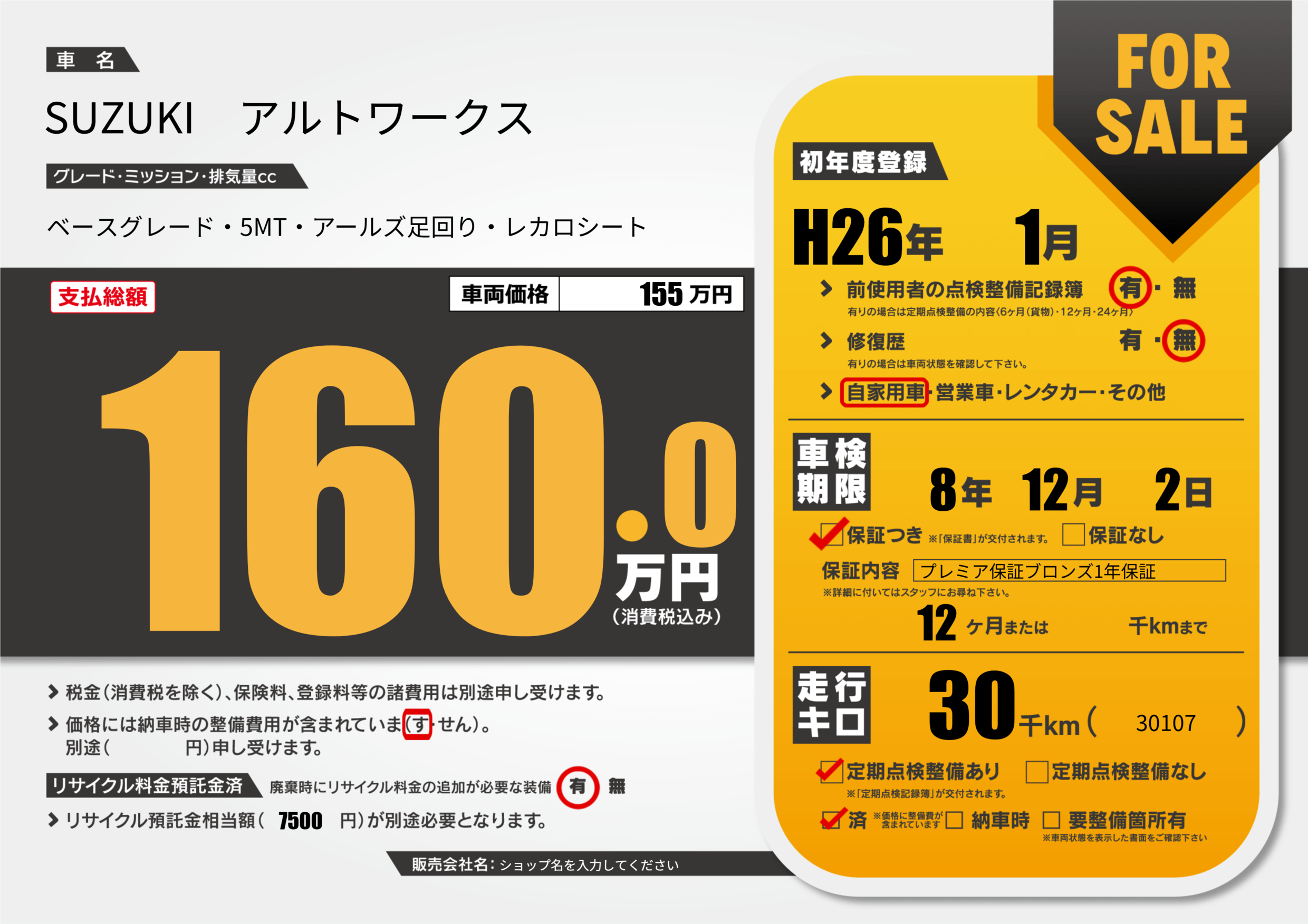 | 定期点検整備 | 定期点検整備あり 定期点検整備済み | ||