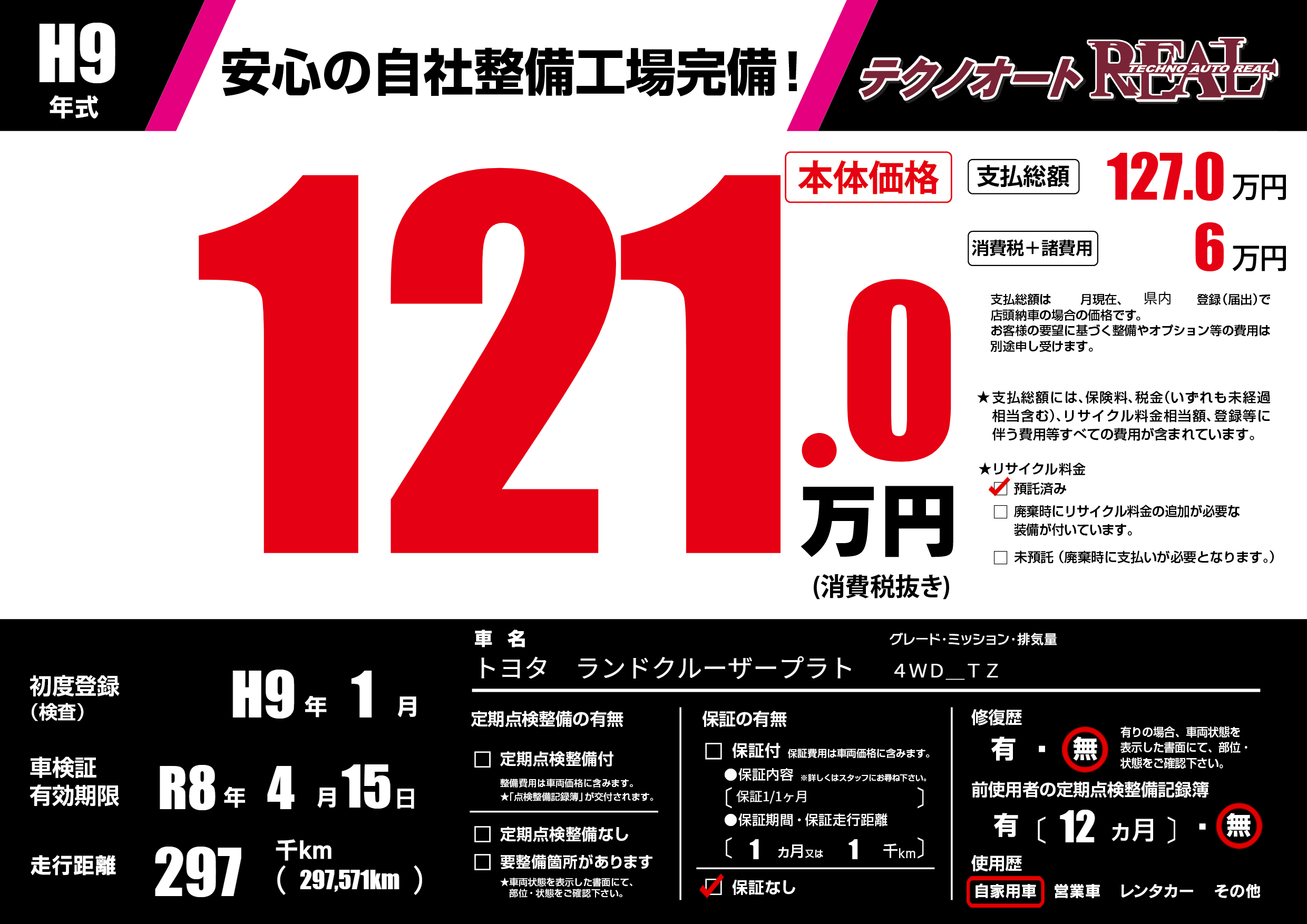 | 車名 | トヨタ ランドクルーザープラト | グレード ミッション 排気量 |