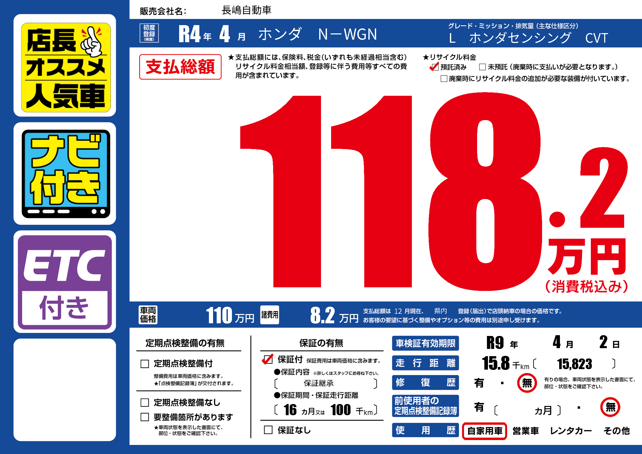 | 車名 | ホンダ N-WGN | グレード ミッション 排気量 |