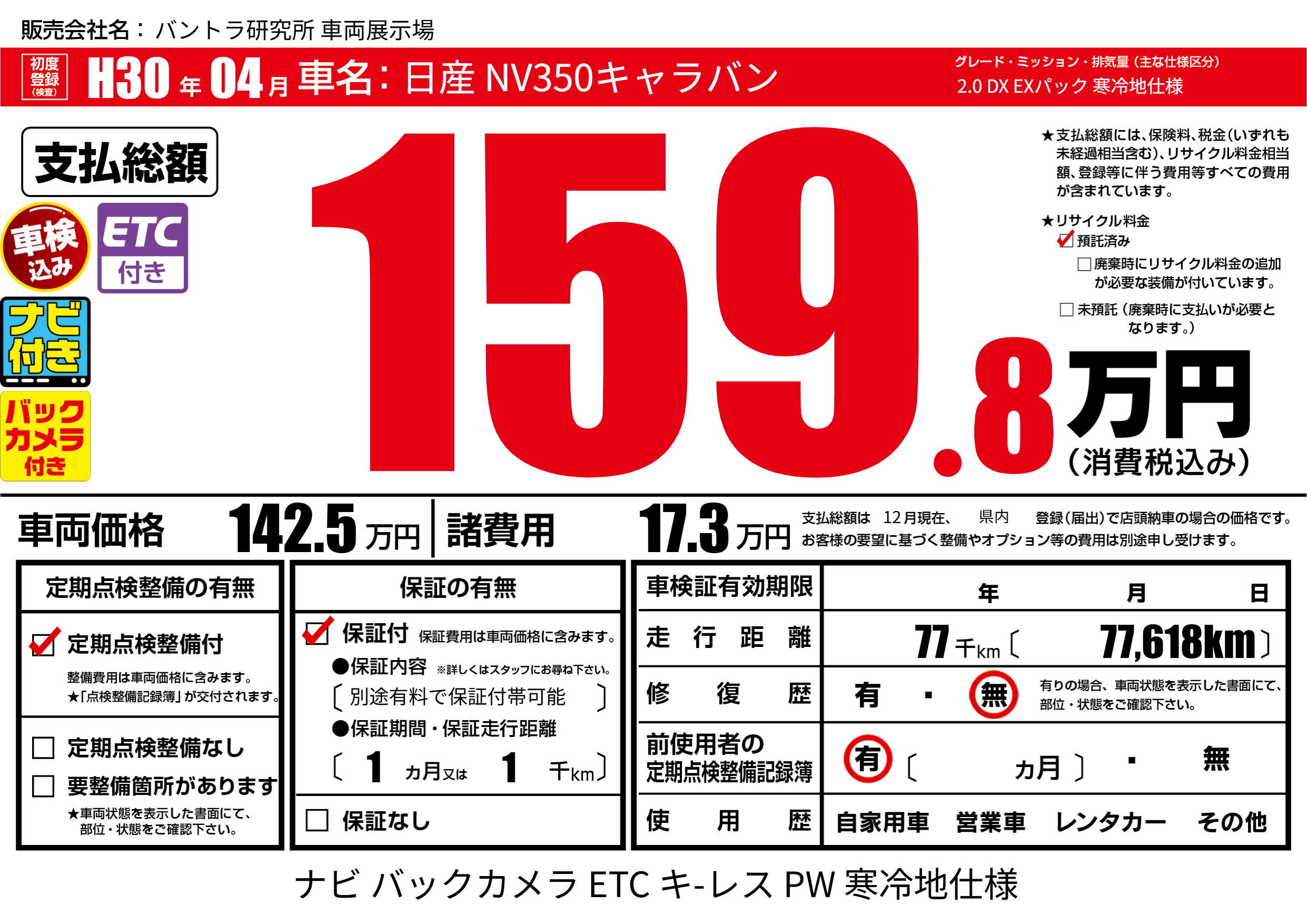 | 車名 | 日産 NV350キャラバン | グレード ミッション 排気量 |