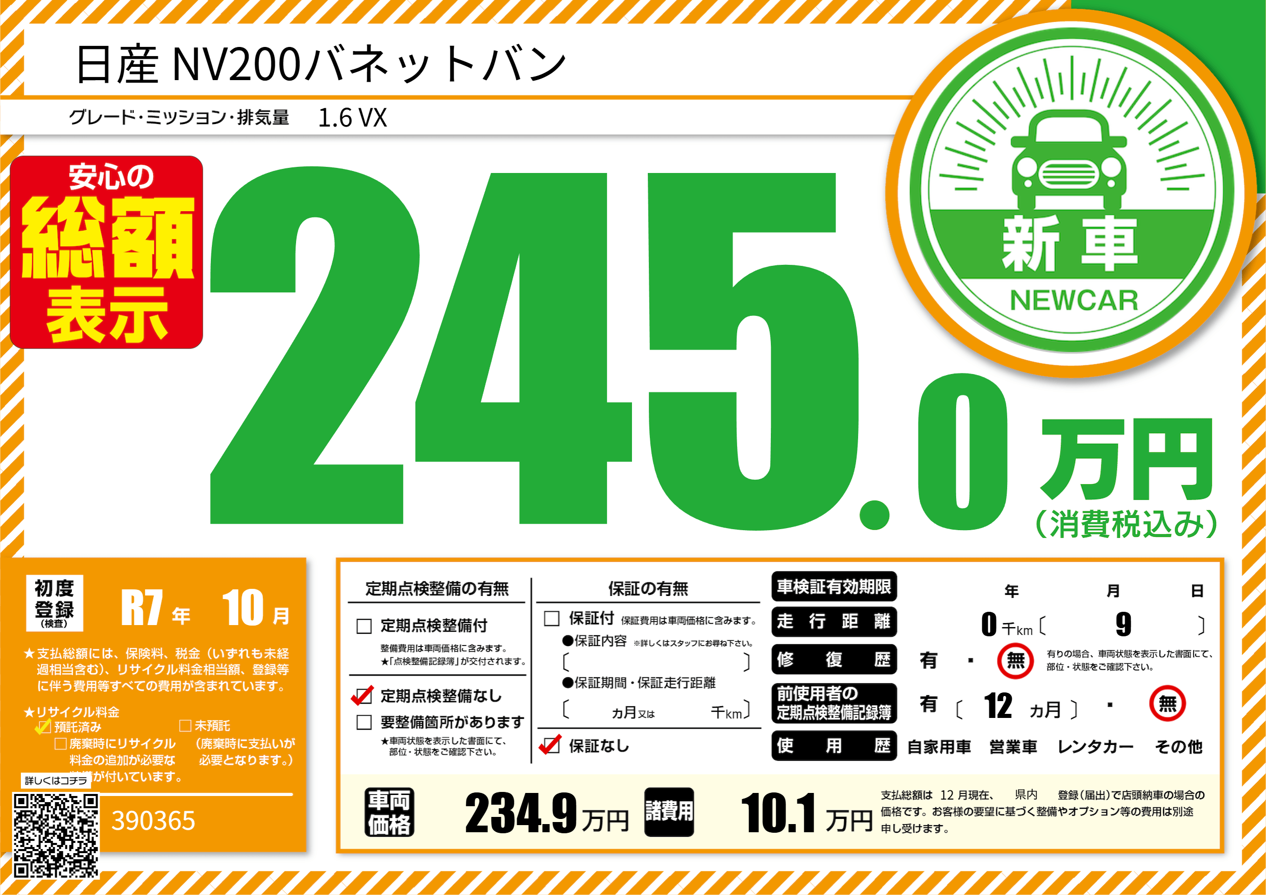 | 車名 | 日産 NV200バネットバン | グレード ミッション 排気量 |