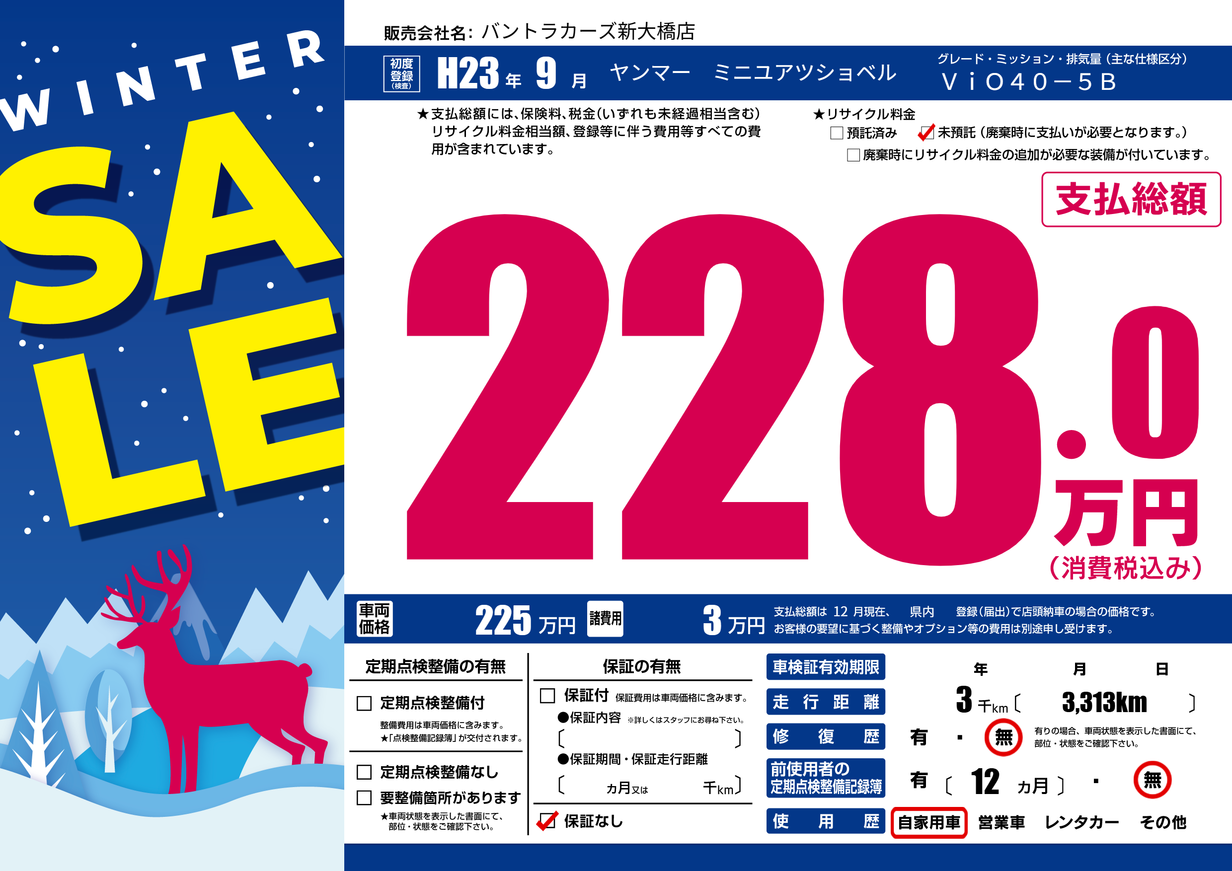 | 走行キロ | 0.3万km | 初年度登録 | H23年9月 |