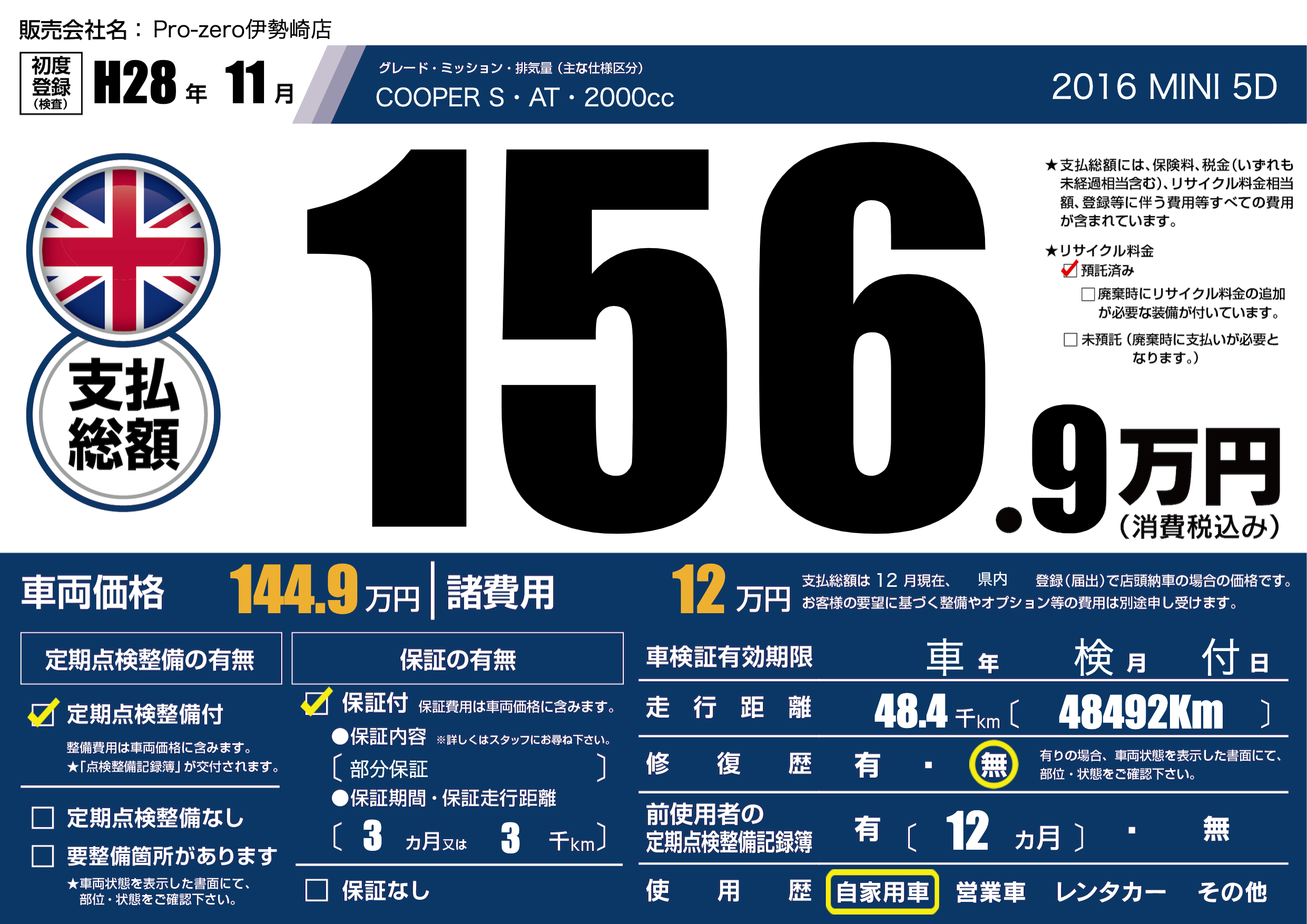 | 車名 | 2016 MINI 5D | グレード ミッション 排気量 |