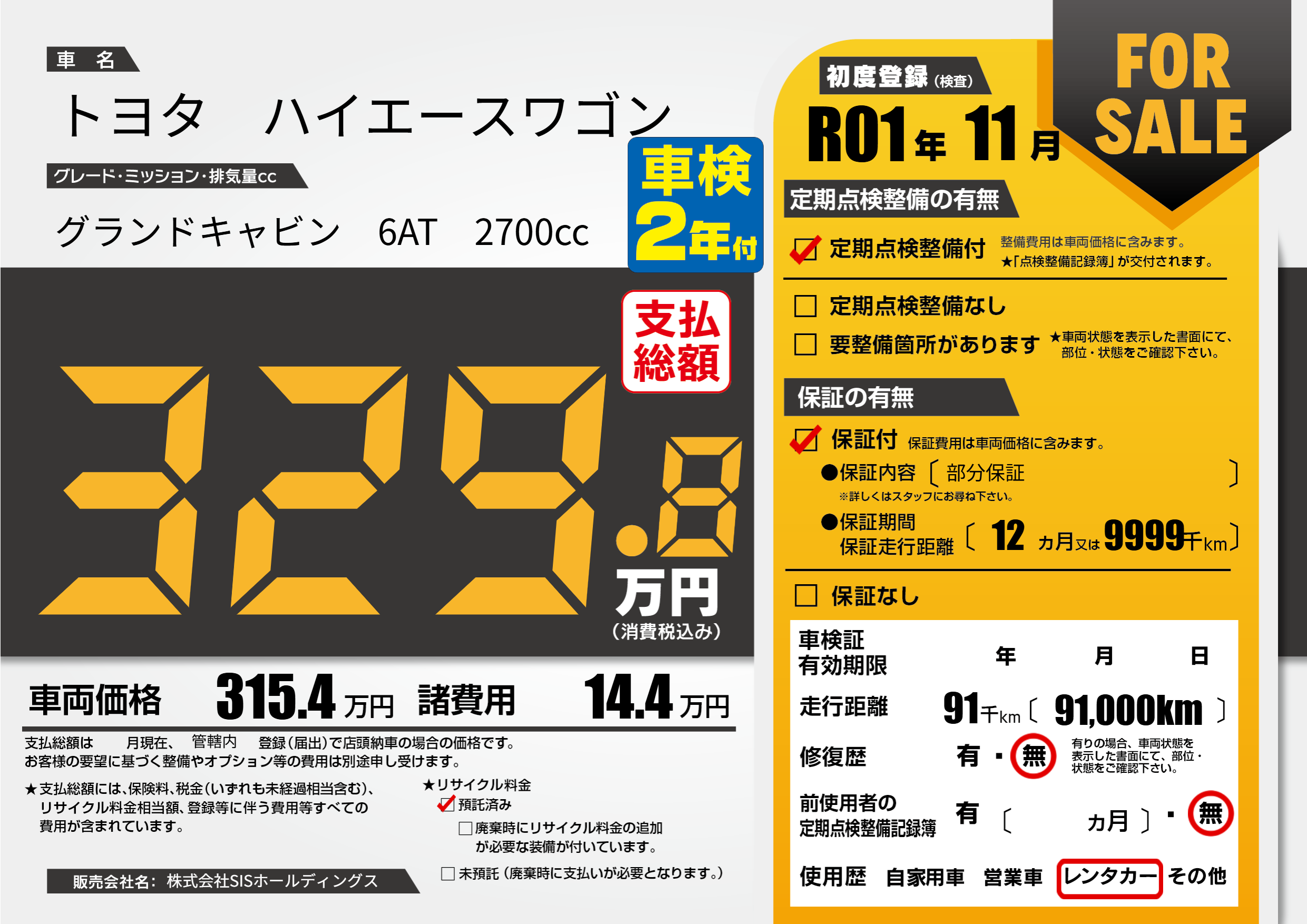 | 走行キロ | 9.1万km | 初年度登録 | R01年11月 |