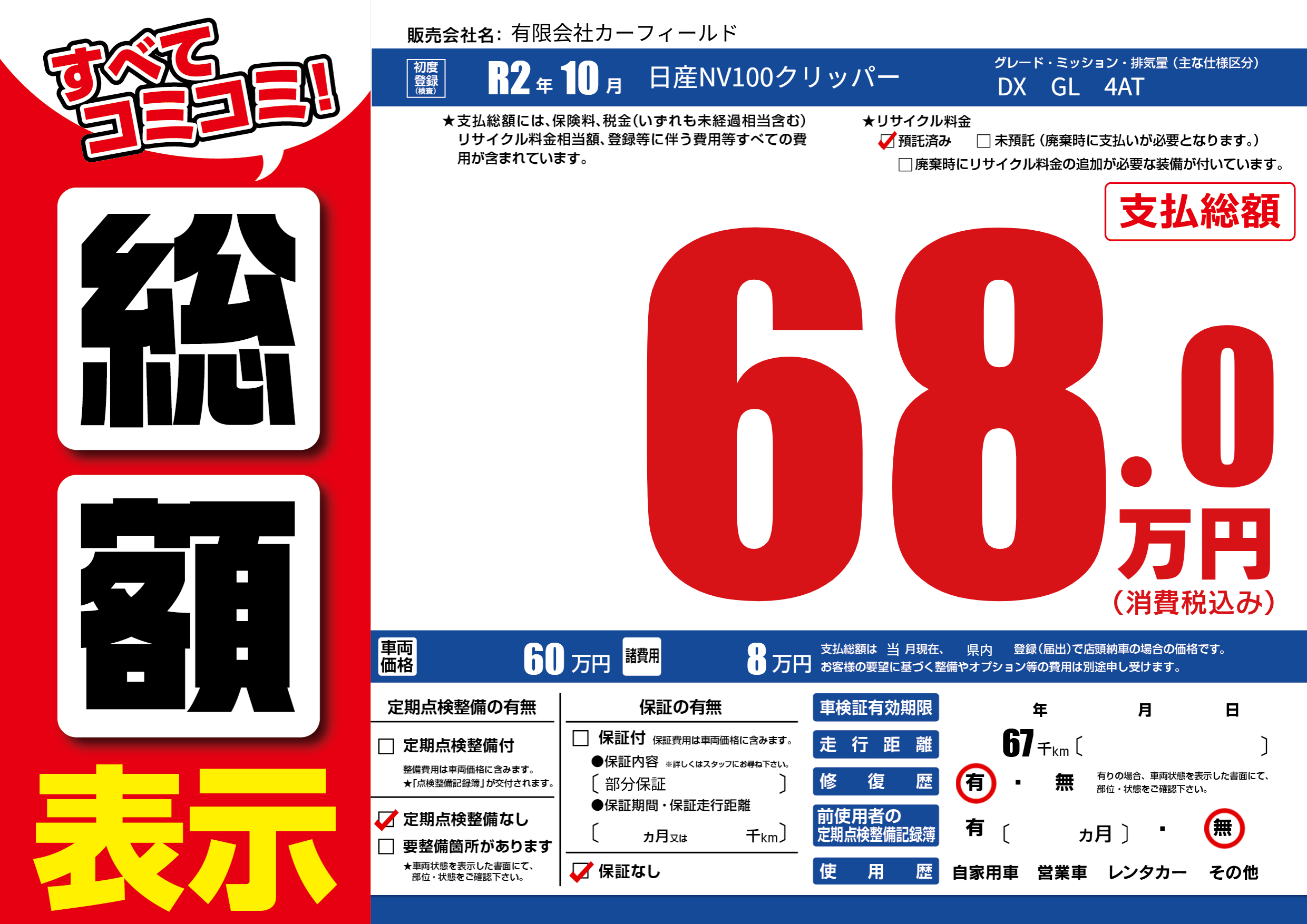| 車名 | 日産NV100クリッパー | グレード ミッション 排気量 |