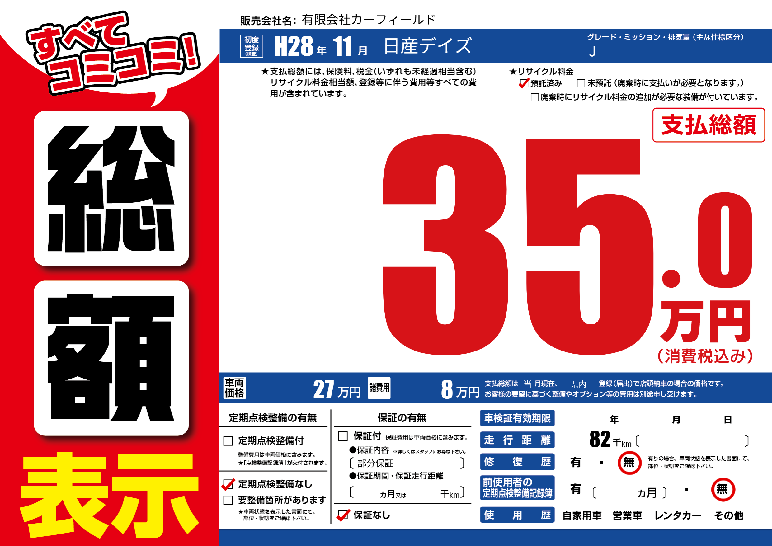 | 車名 | 日産デイズ | グレード ミッション 排気量 |