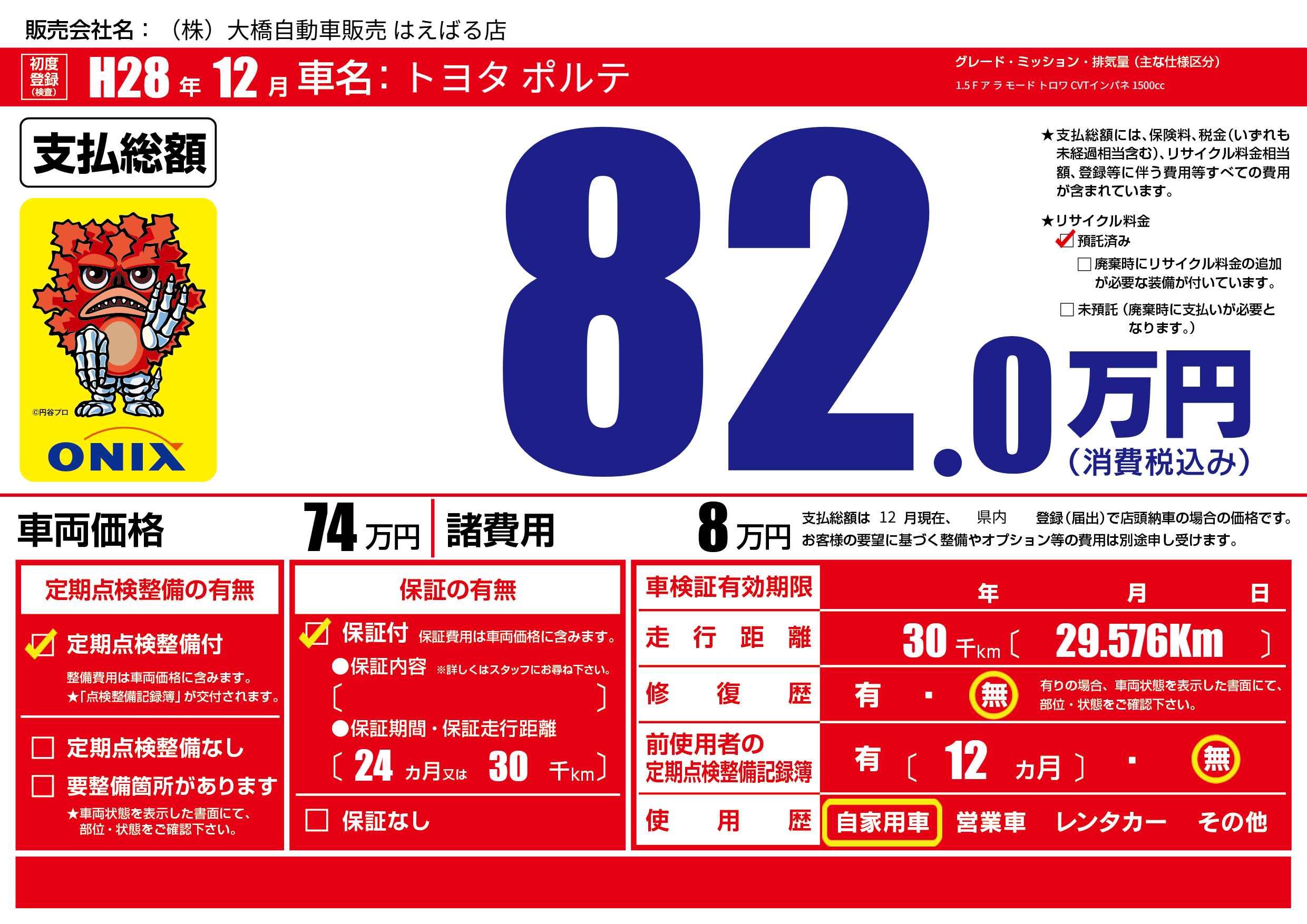 保証付き 保証内容(---) 24ヶ月または(30)千kmまで |