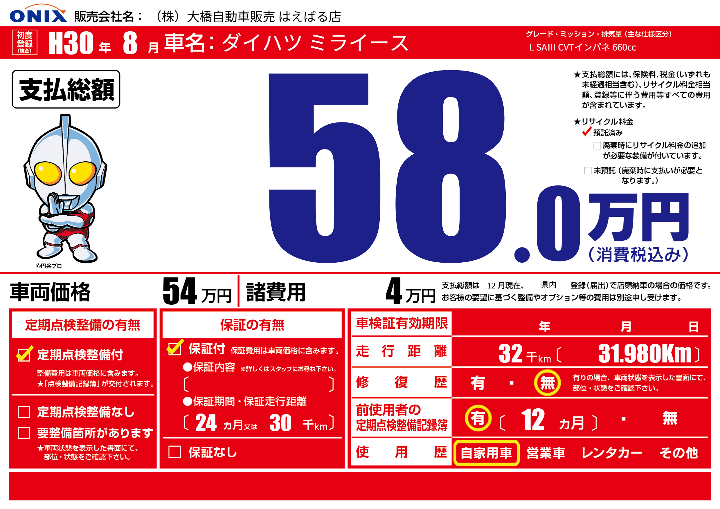 保証付き 保証内容(---) 24ヶ月または(30)千kmまで |