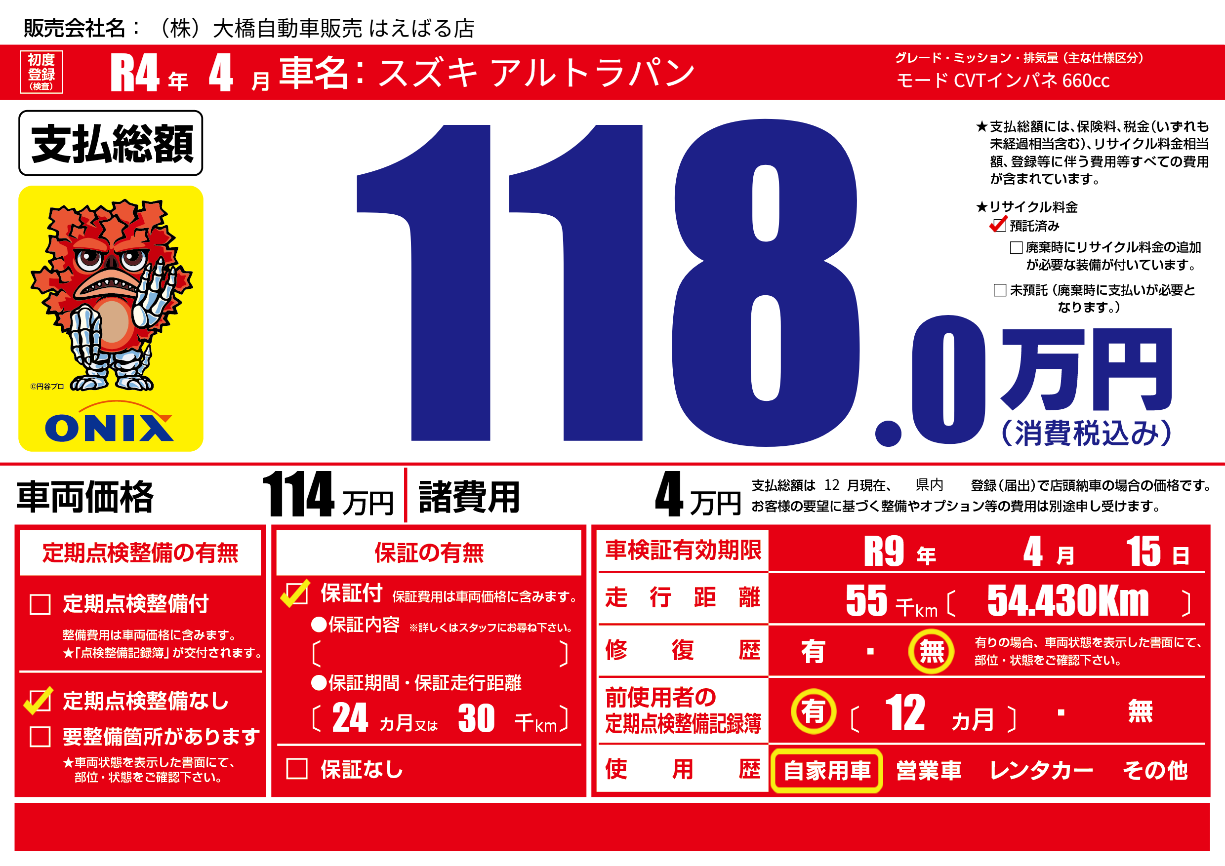 | 走行キロ | 5.5万km | 初年度登録 | R4年4月 |