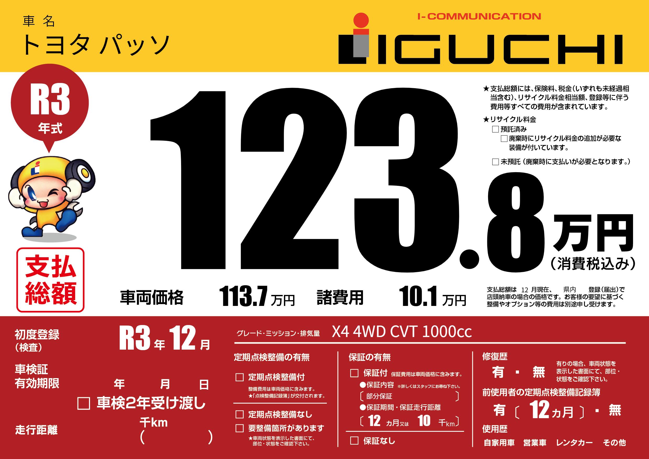 | 車名 | トヨタ パッソ | グレード ミッション 排気量 |