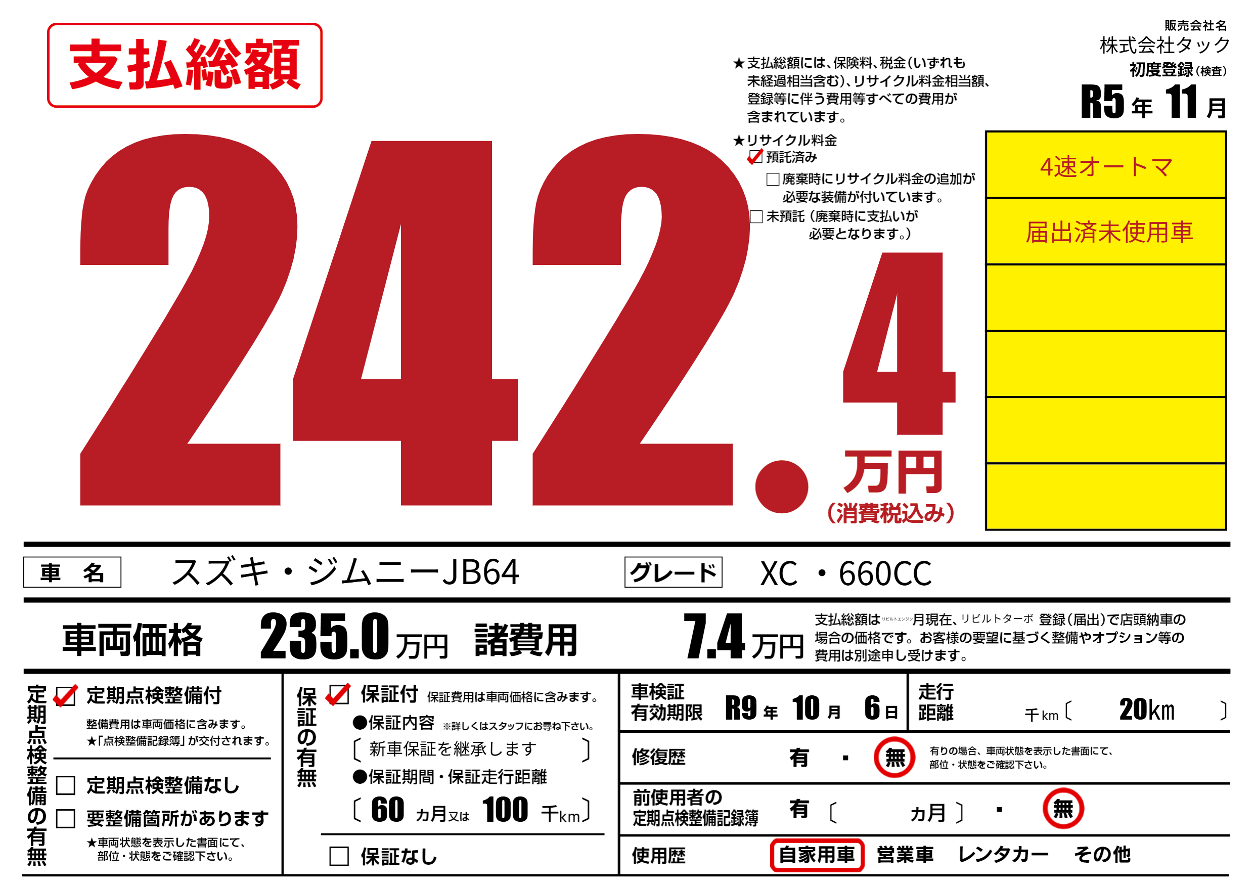 | 走行キロ | - | 初年度登録 | R5年11月 |