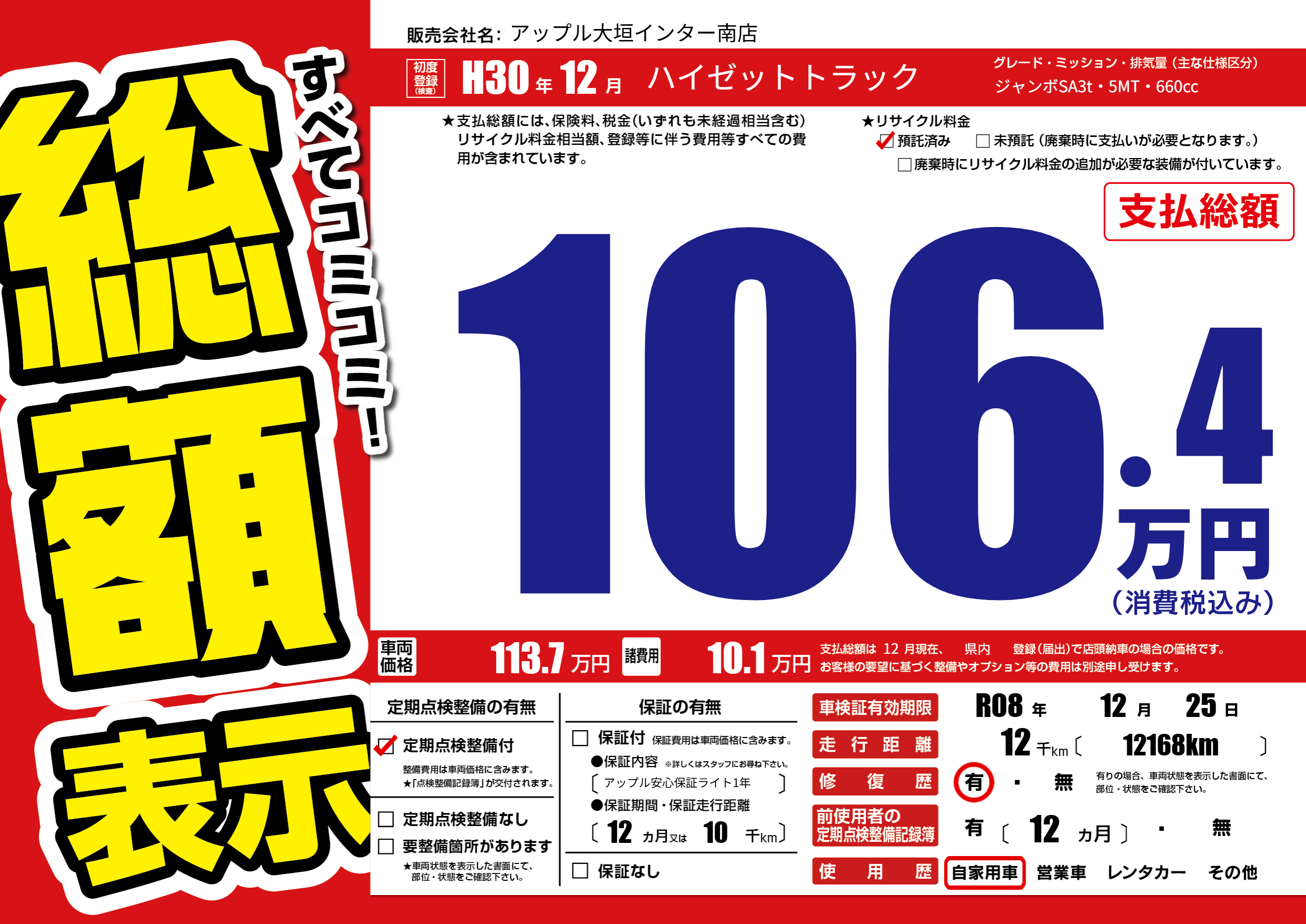 | 走行キロ | 1.2万km | 初年度登録 | H30年12月 |