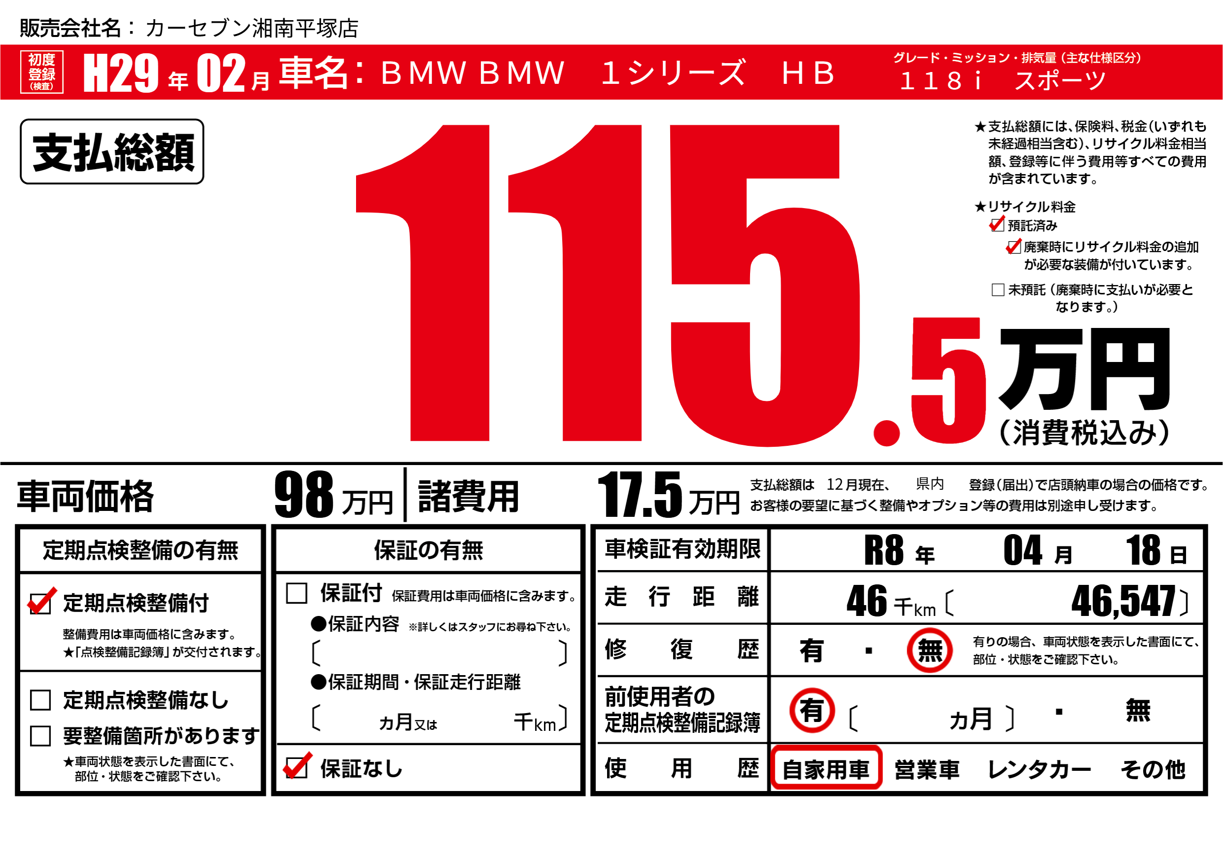 | 車名 | BMW BMW 1シリーズ HB | グレード ミッション 排気量 |