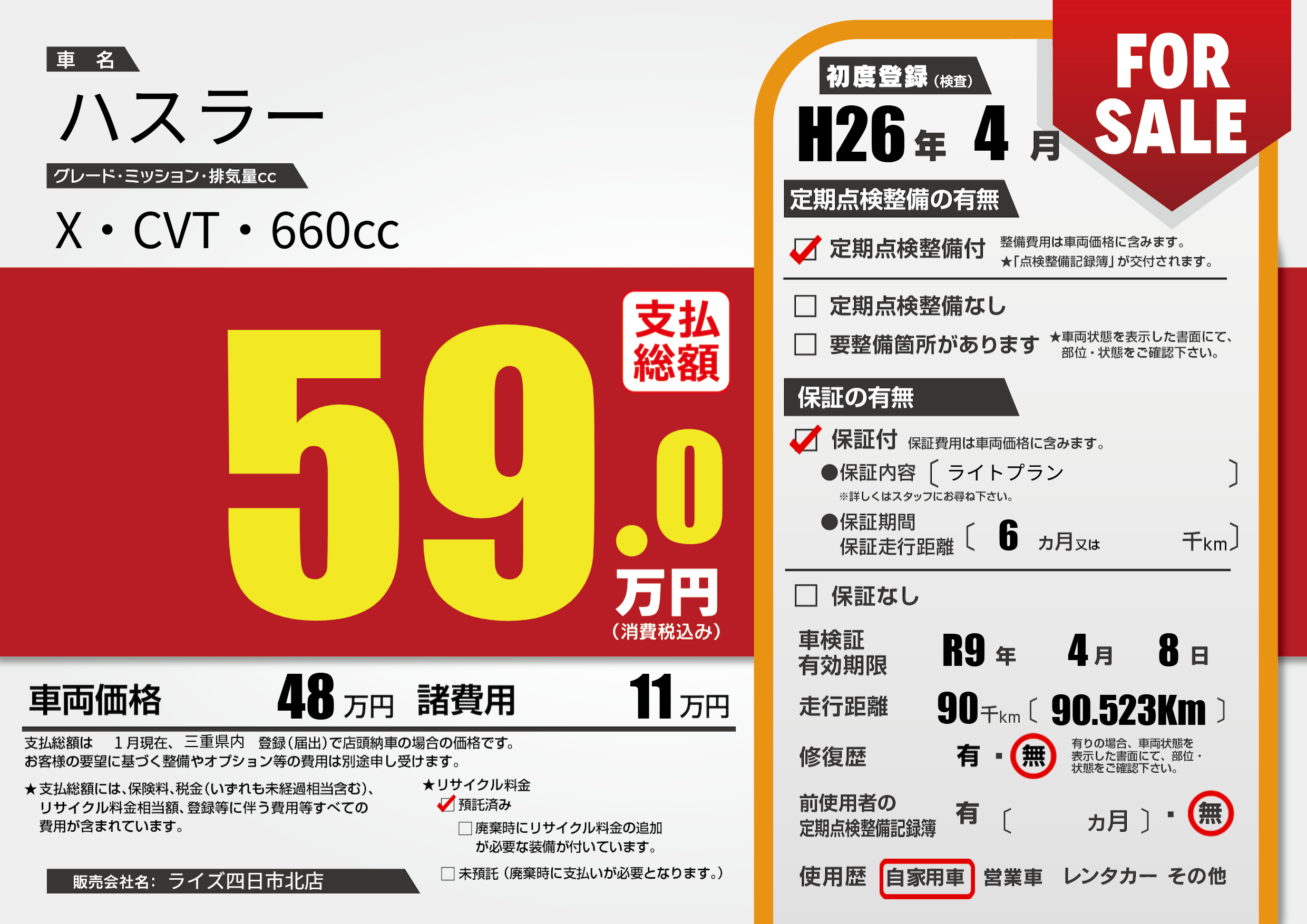 | 走行キロ | 9万km | 初年度登録 | H26年4月 |