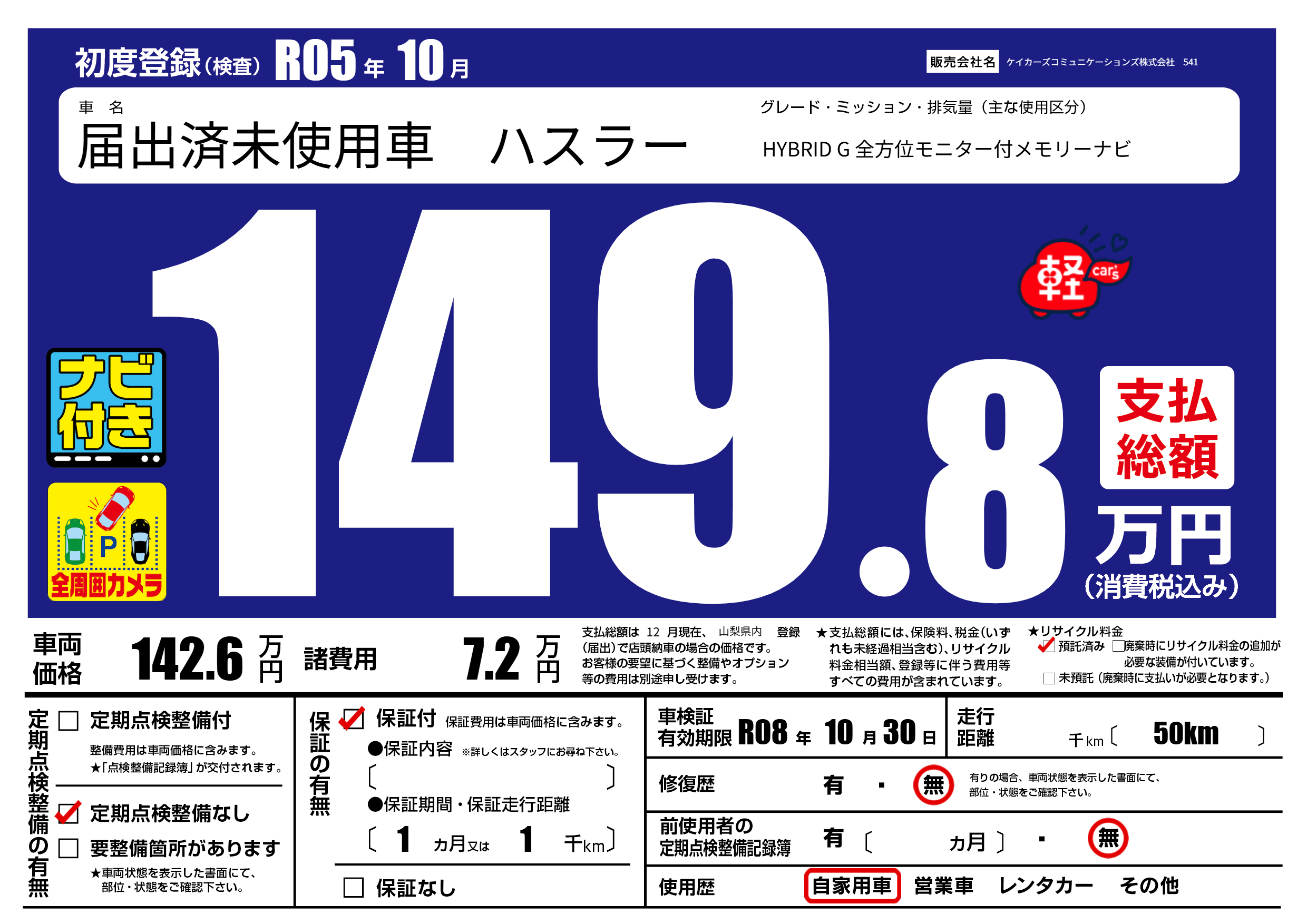 | 走行キロ | - | 初年度登録 | R05年10月 |