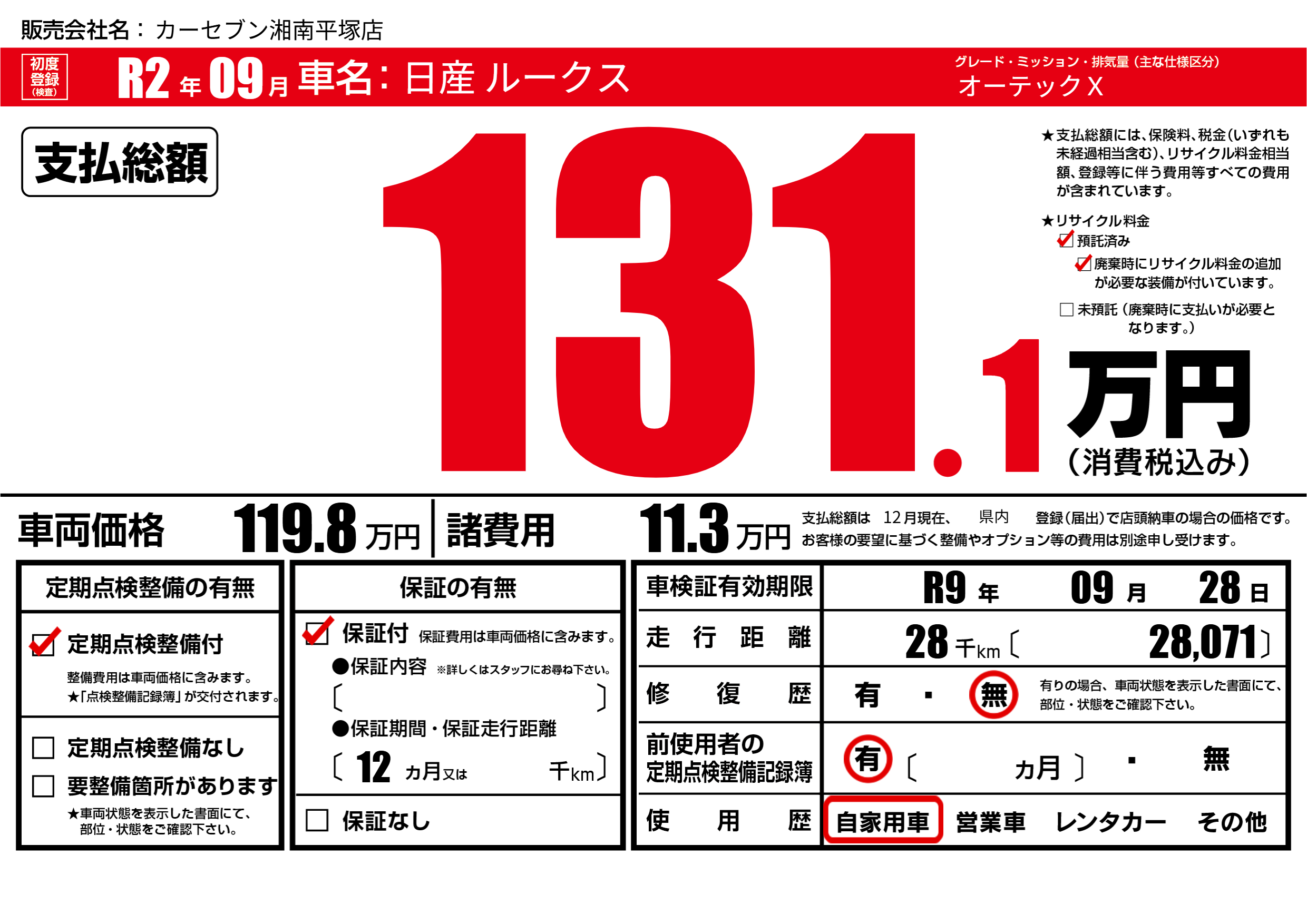 | 走行キロ | 2.8万km | 初年度登録 | R2年09月 |