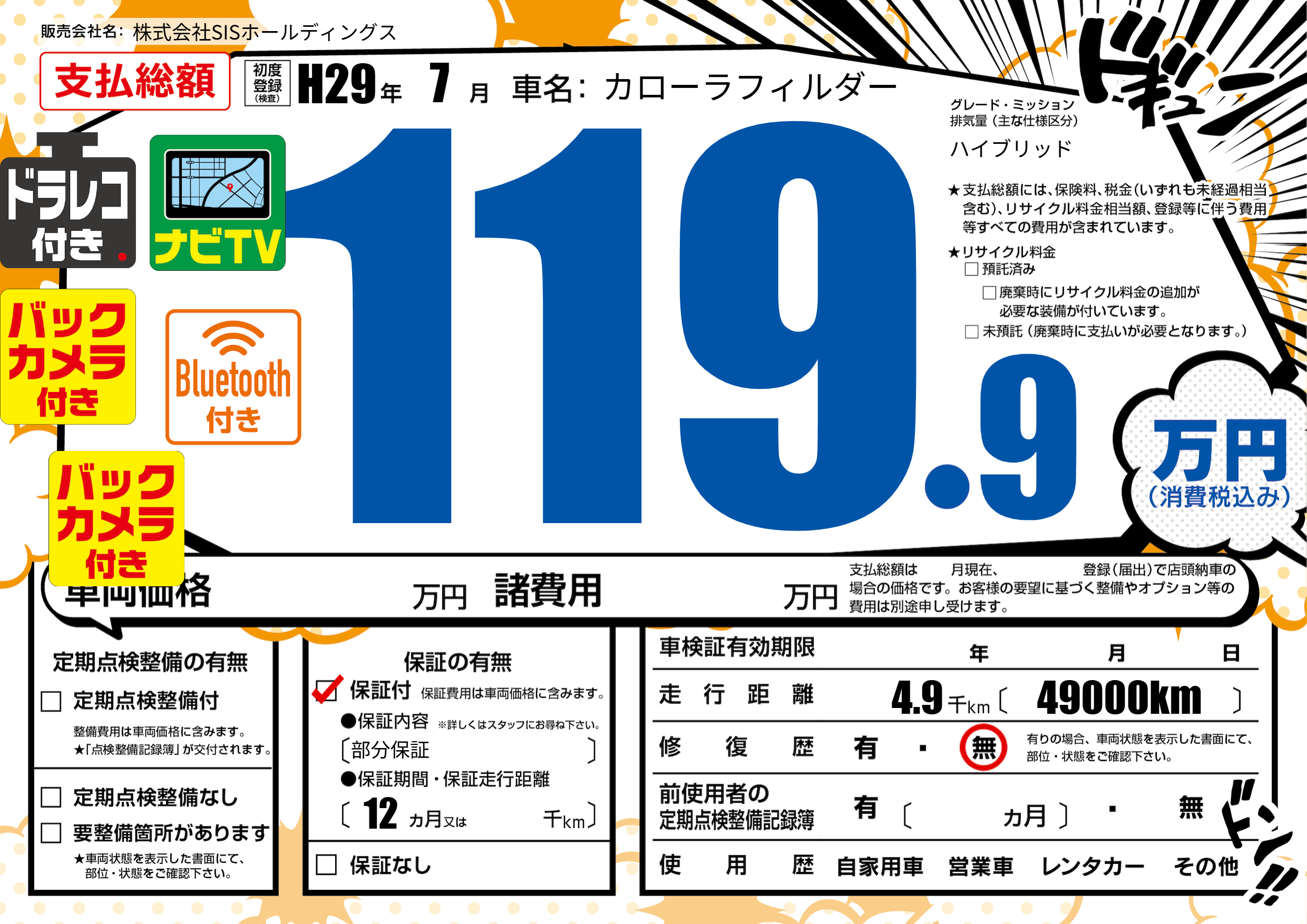 | 走行キロ | 0.4万km | 初年度登録 | H29年7月 |