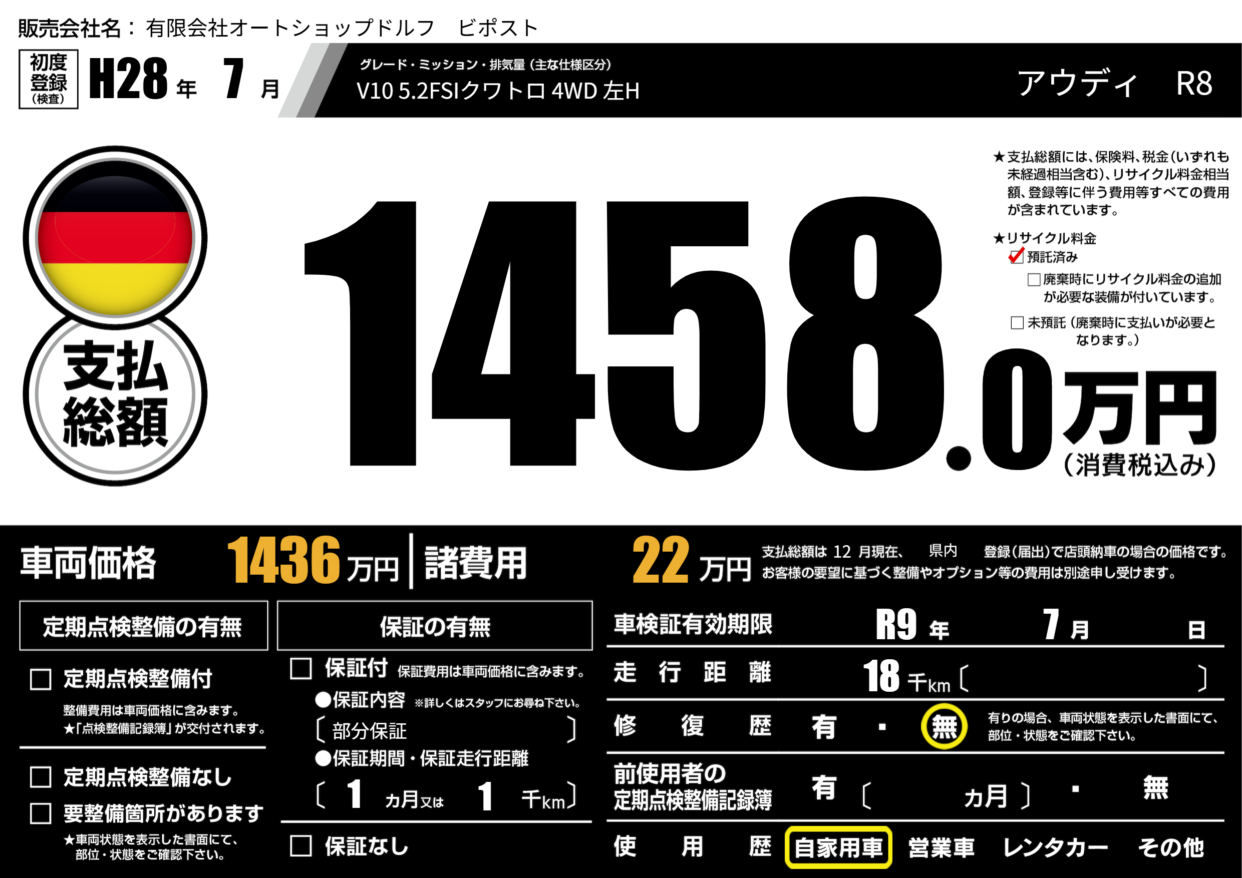 | 車名 | アウディ R8 | グレード ミッション 排気量 |