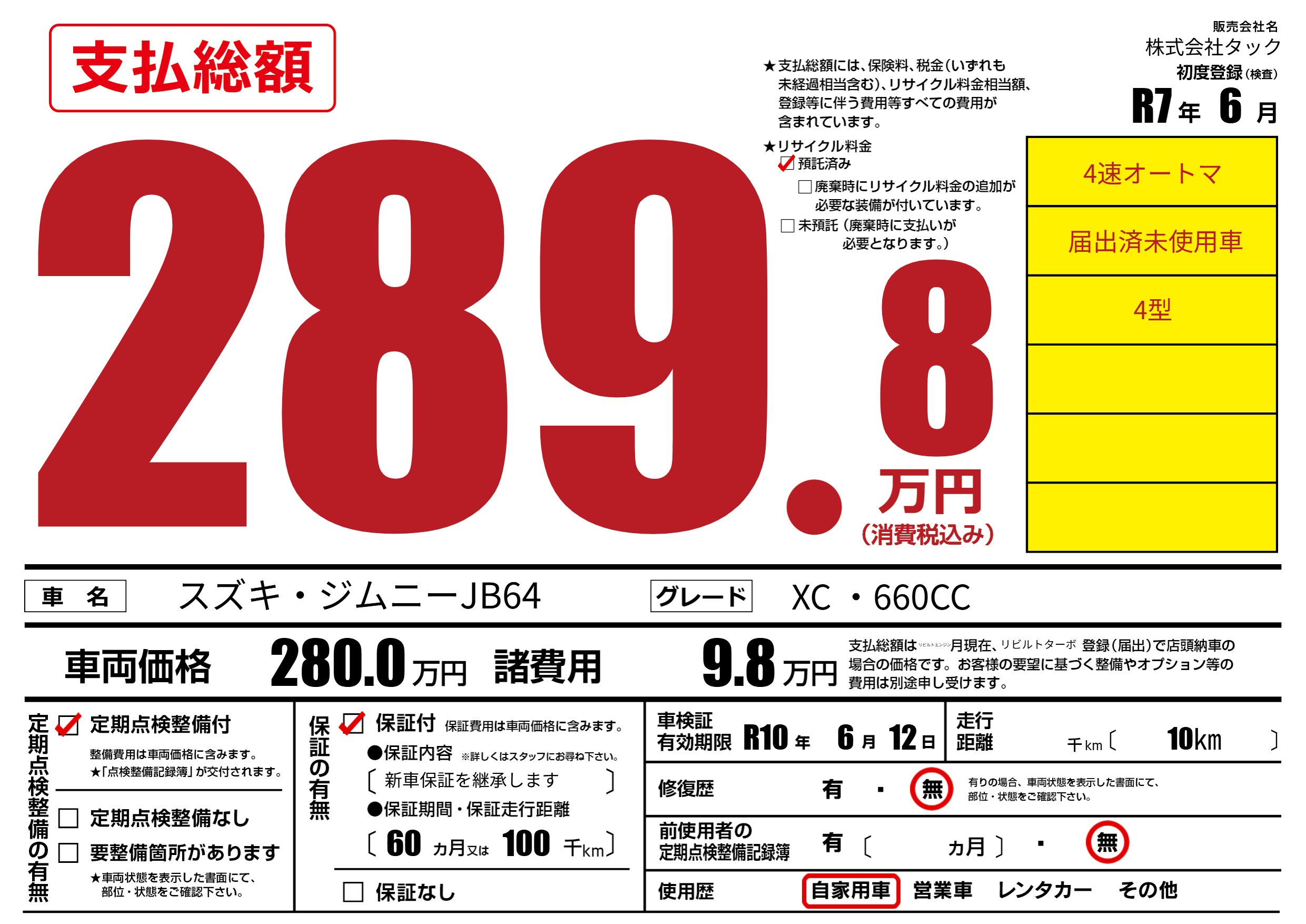 | 車名 | スズキ・ジムニーJB64 | グレード ミッション 排気量 |