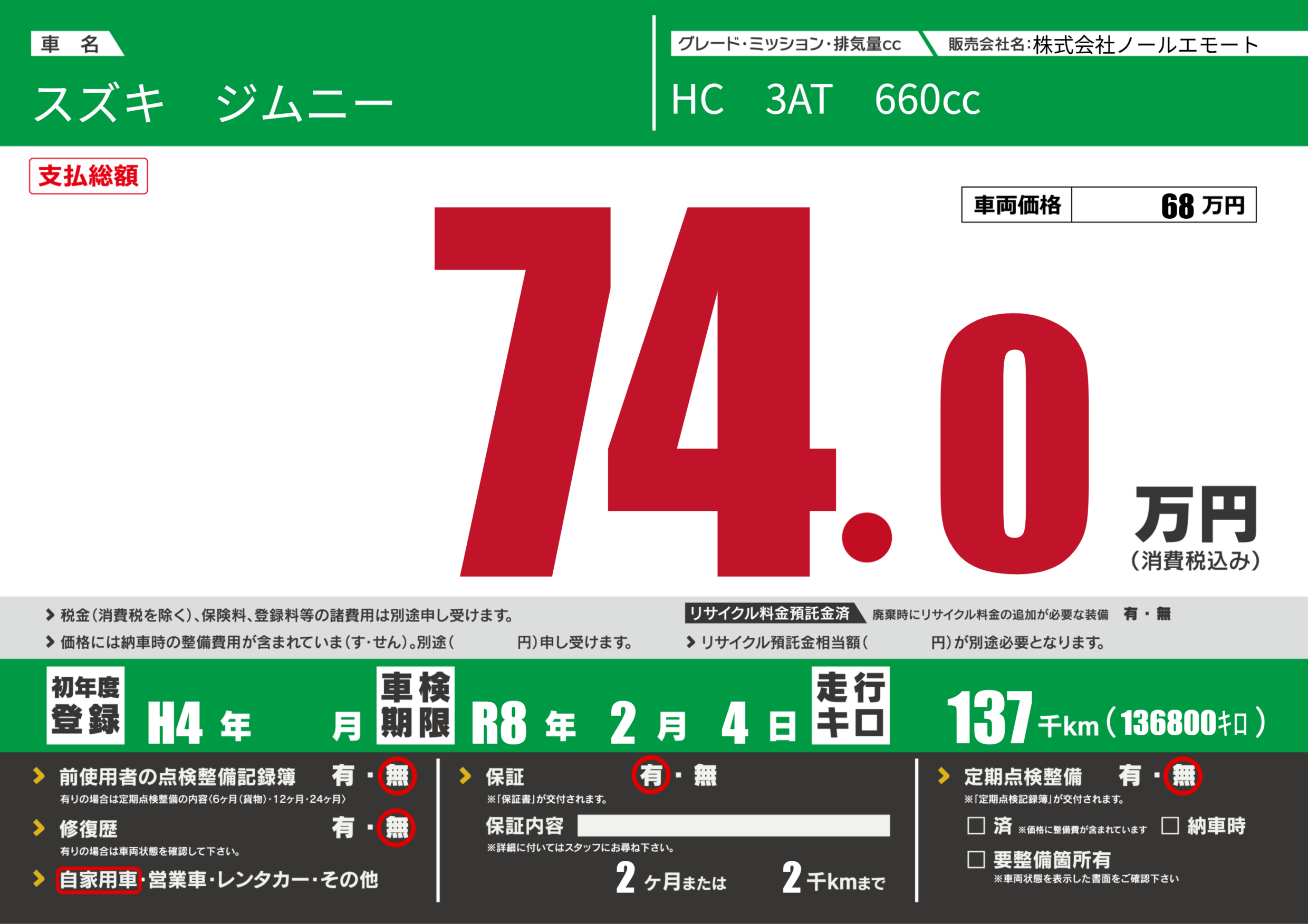 | 走行キロ | 13.7万km | 初年度登録 | H4年---月 |