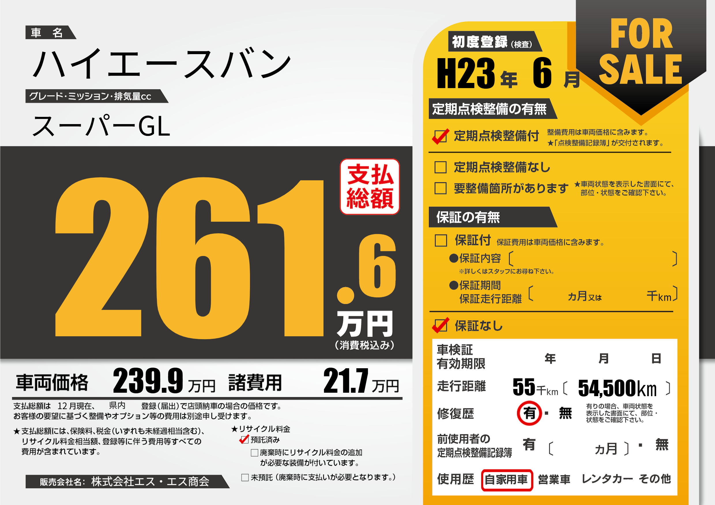 | 走行キロ | 5.5万km | 初年度登録 | H23年6月 |