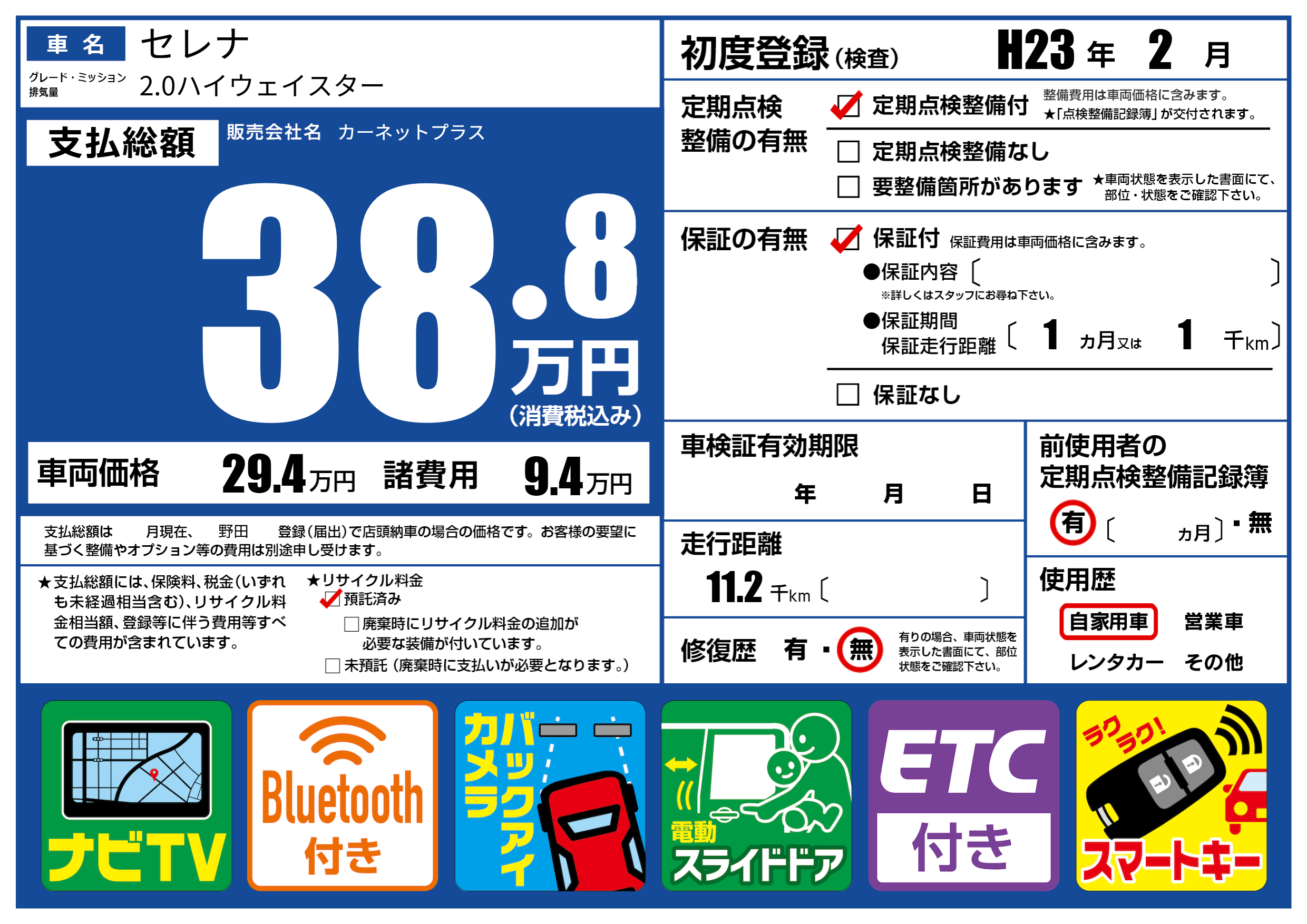 | 走行キロ | 1.1万km | 初年度登録 | H23年2月 |