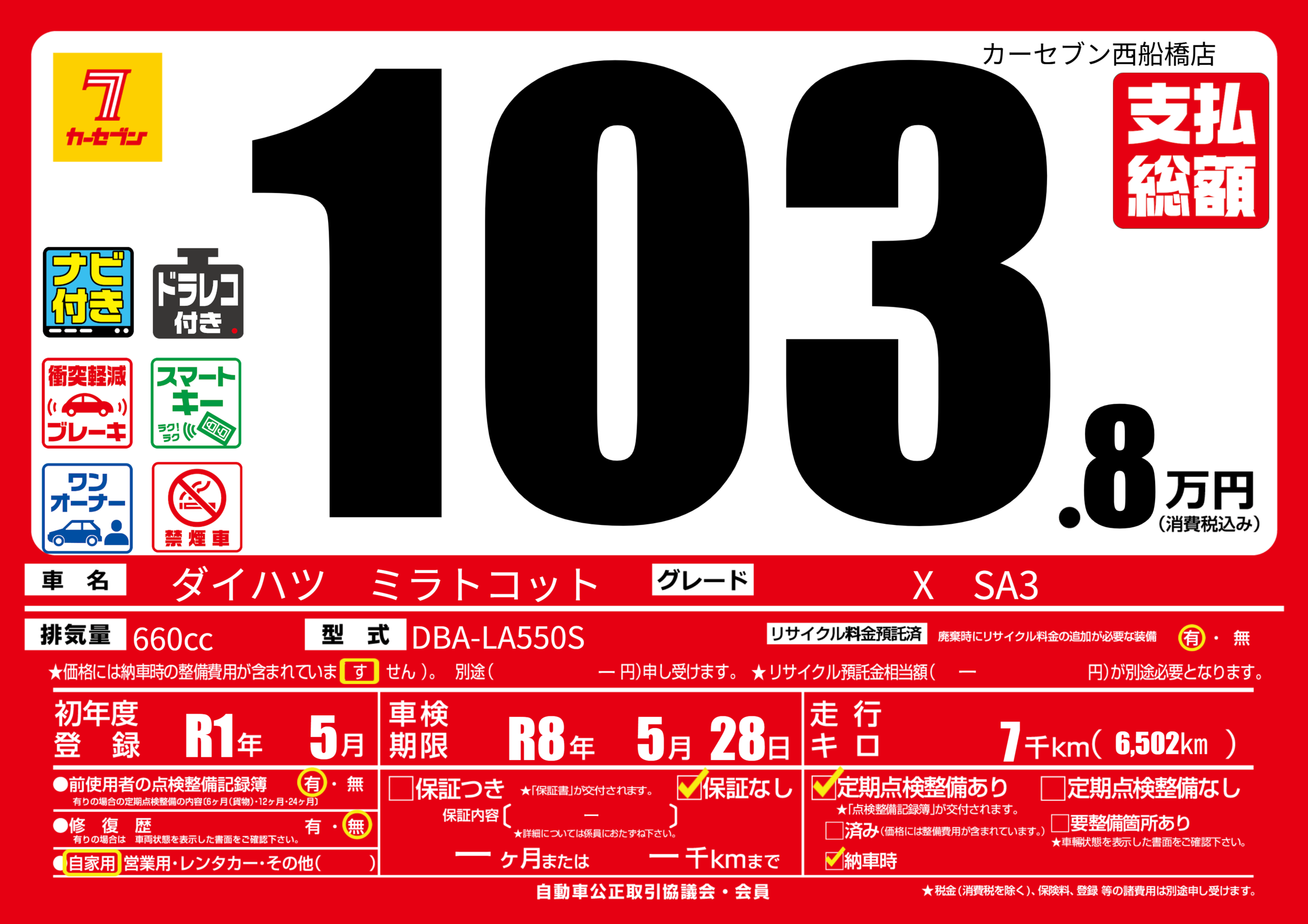| 走行キロ | 0.7万km | 初年度登録 | R1年5月 |