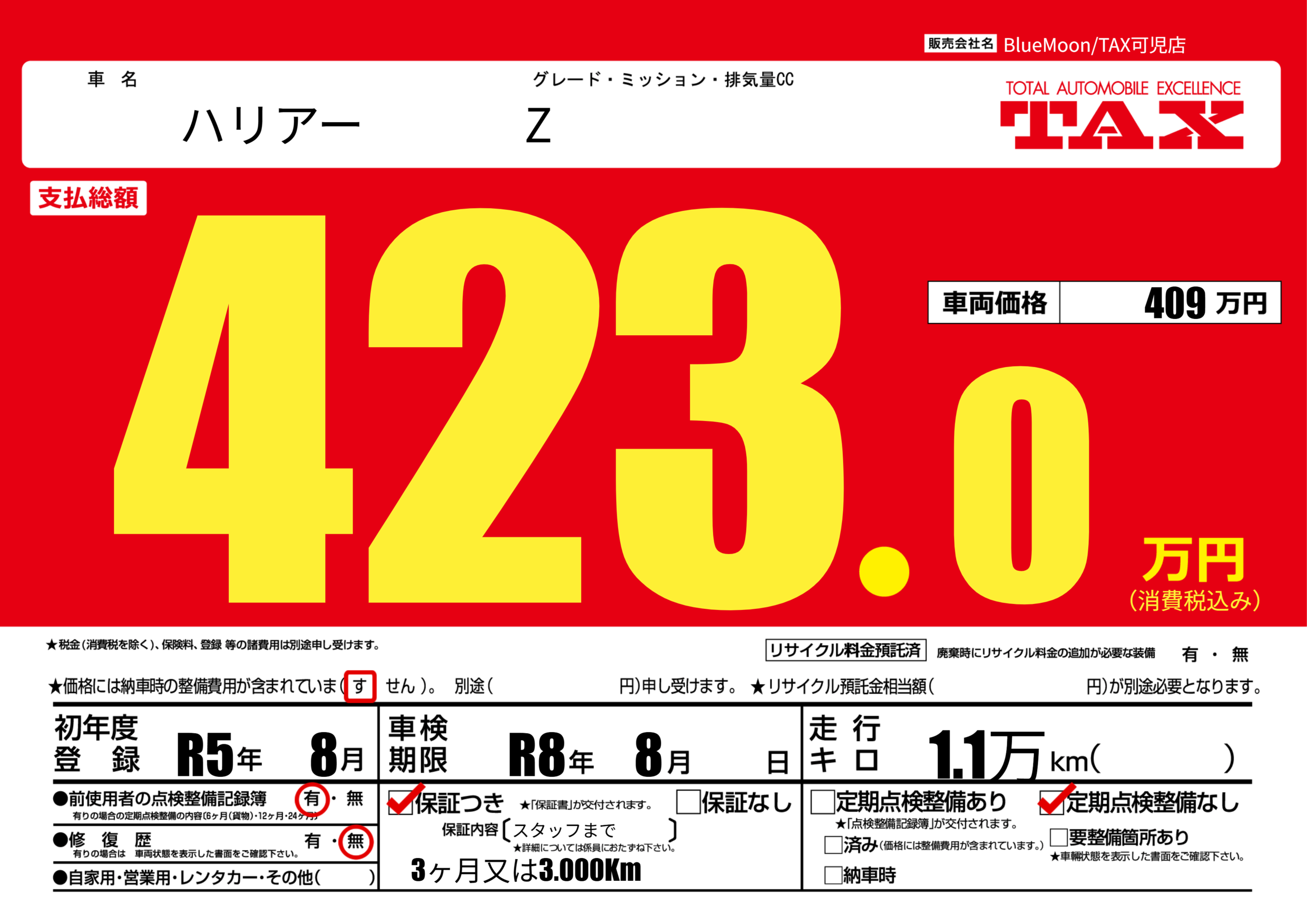 | 走行キロ | 0.1万km | 初年度登録 | R5年8月 |