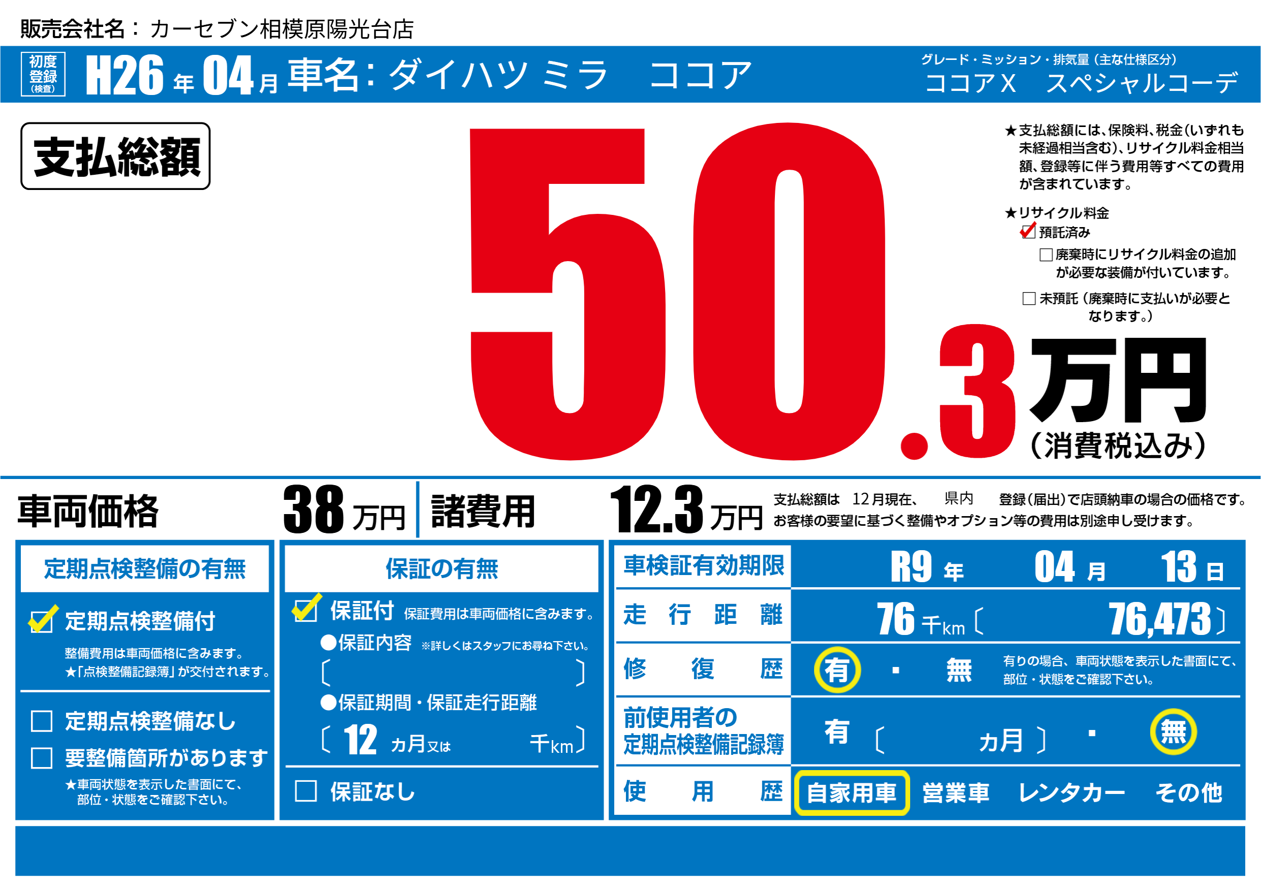| 走行キロ | 7.6万km | 初年度登録 | H26年04月 |
