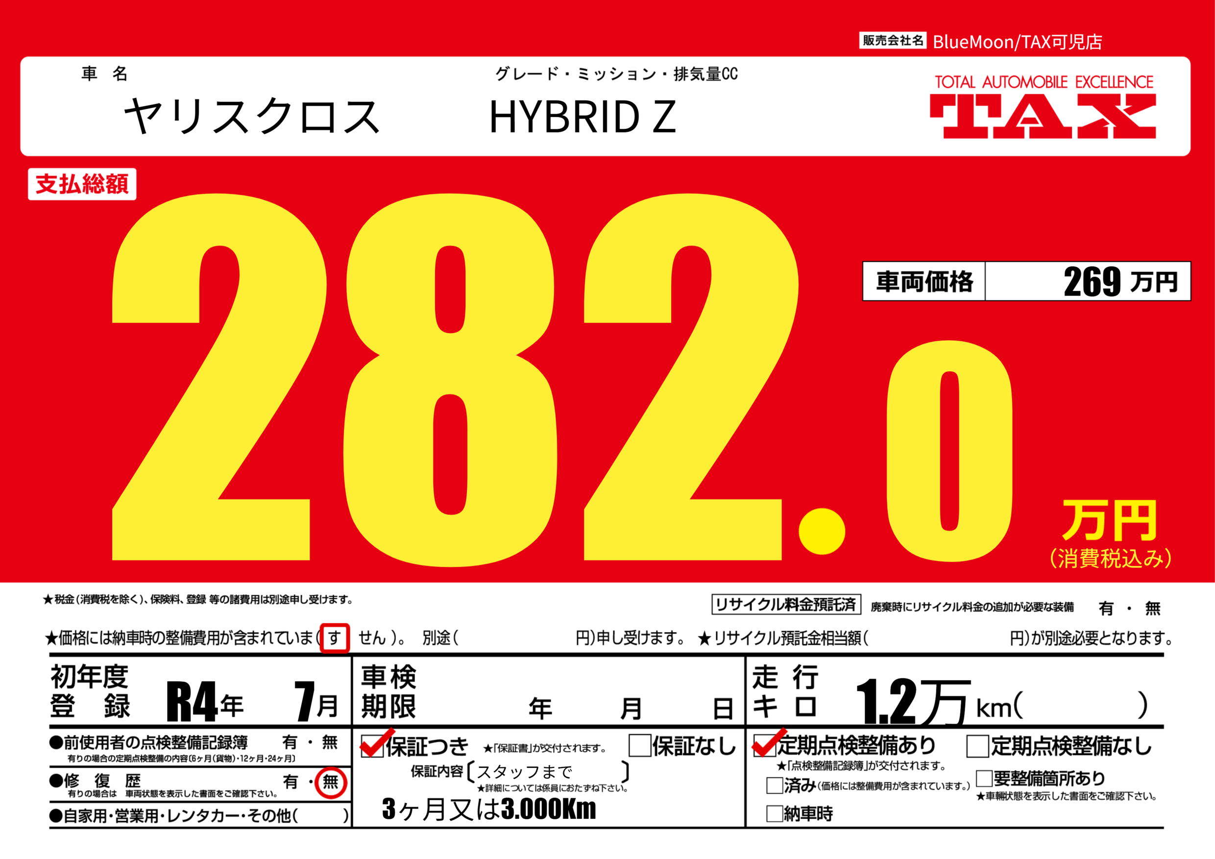 | 車名 | ヤリスクロス | グレード ミッション 排気量 |