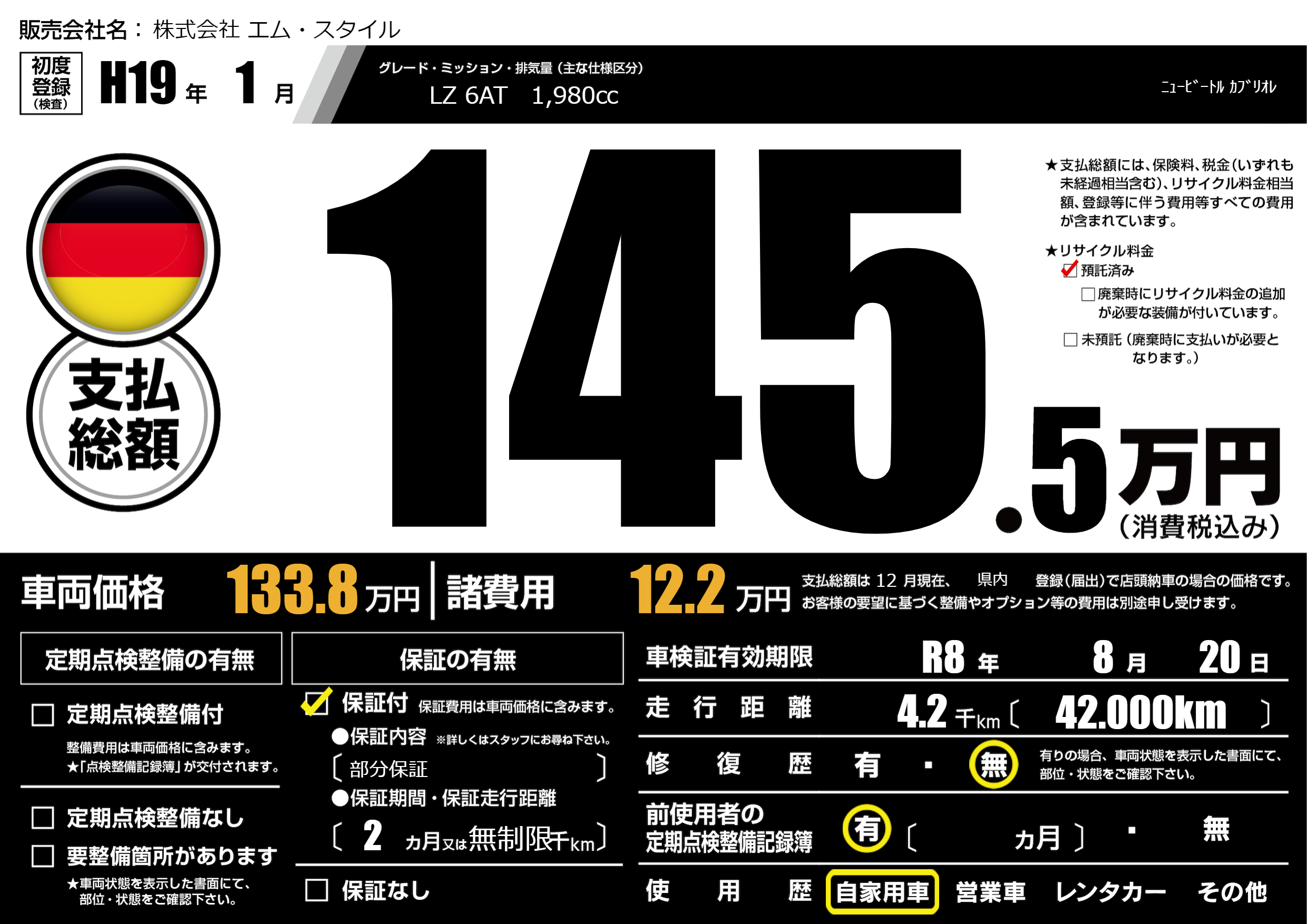 | 走行キロ | 0.4万km | 初年度登録 | H19年1月 |